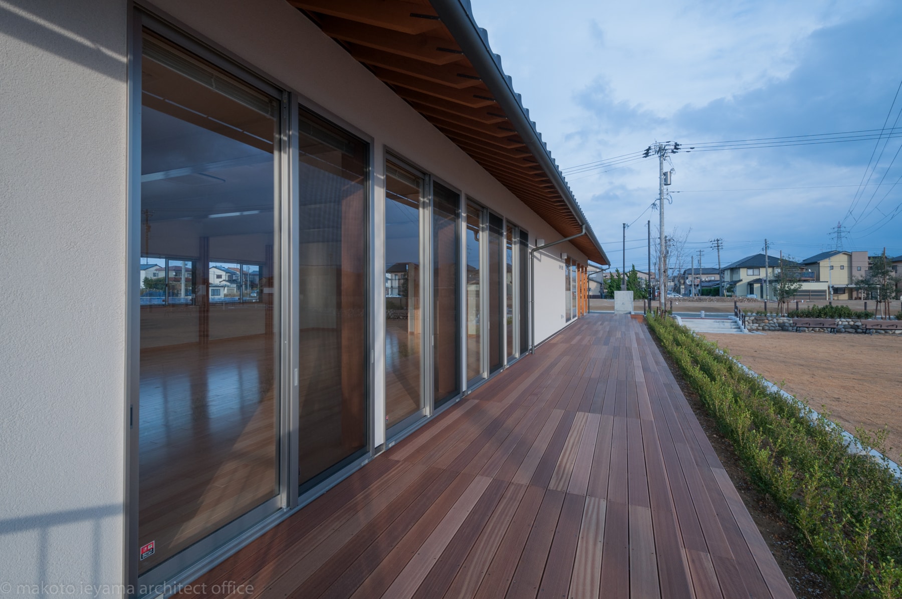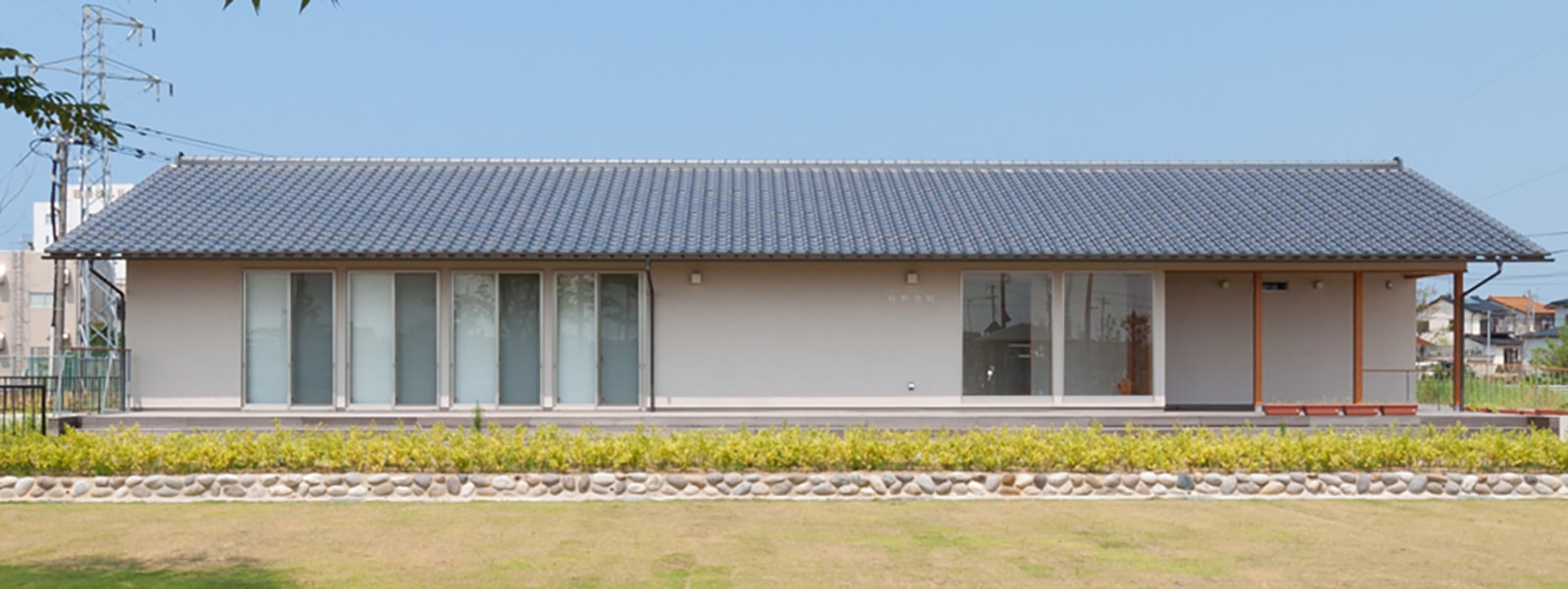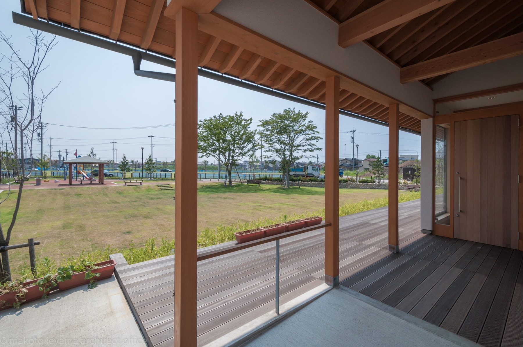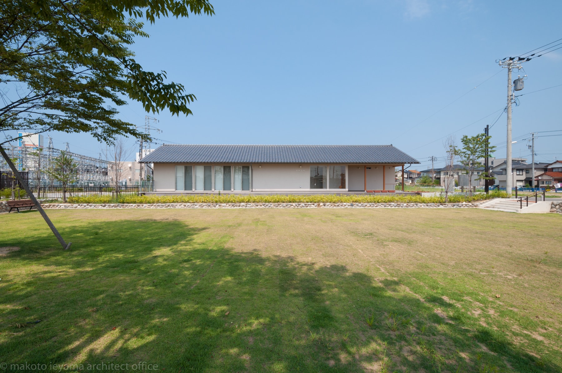 区画整理事業でつくられた三角形の公園の底辺側に位置する場所に町会会館を設計するプロポーザル(設計提案)により建てられました。会館と公園は管理主体が異なるため、本来一体的な配置計画は不可能であったが、市の担当部署との協議を重ね実現しました。単純な切妻屋根の建物が公園に対しての背景となり、背後にある変電施設への視線を遮っています。海岸線から近い地区のため、潮風による耐候性を考慮して屋根は日本瓦葺きとしています。