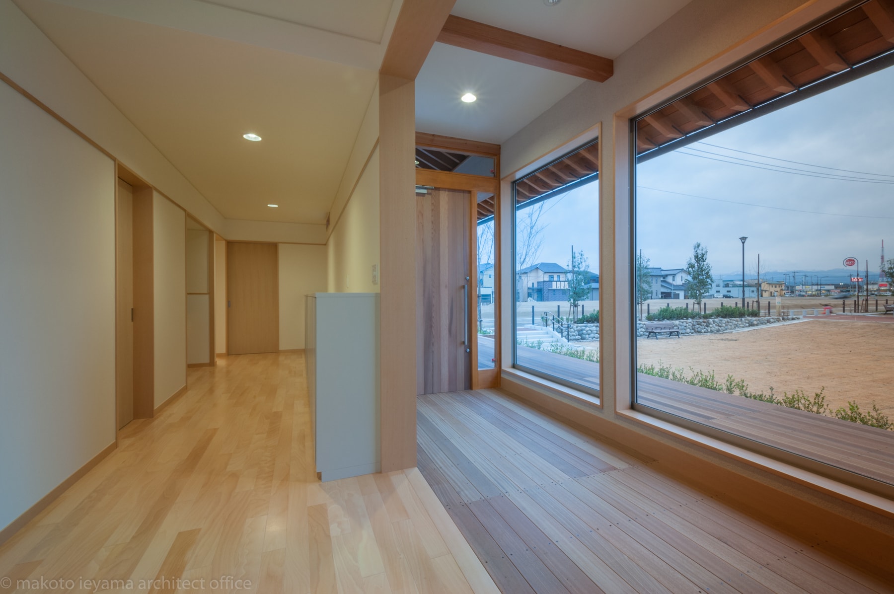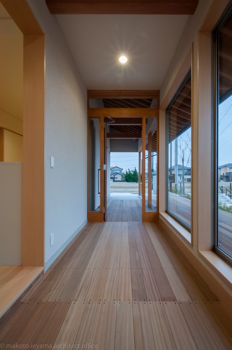 玄関に続く廊下。 室内の廊下、玄関、外部のウッドデッキと木製の床面が連続します。