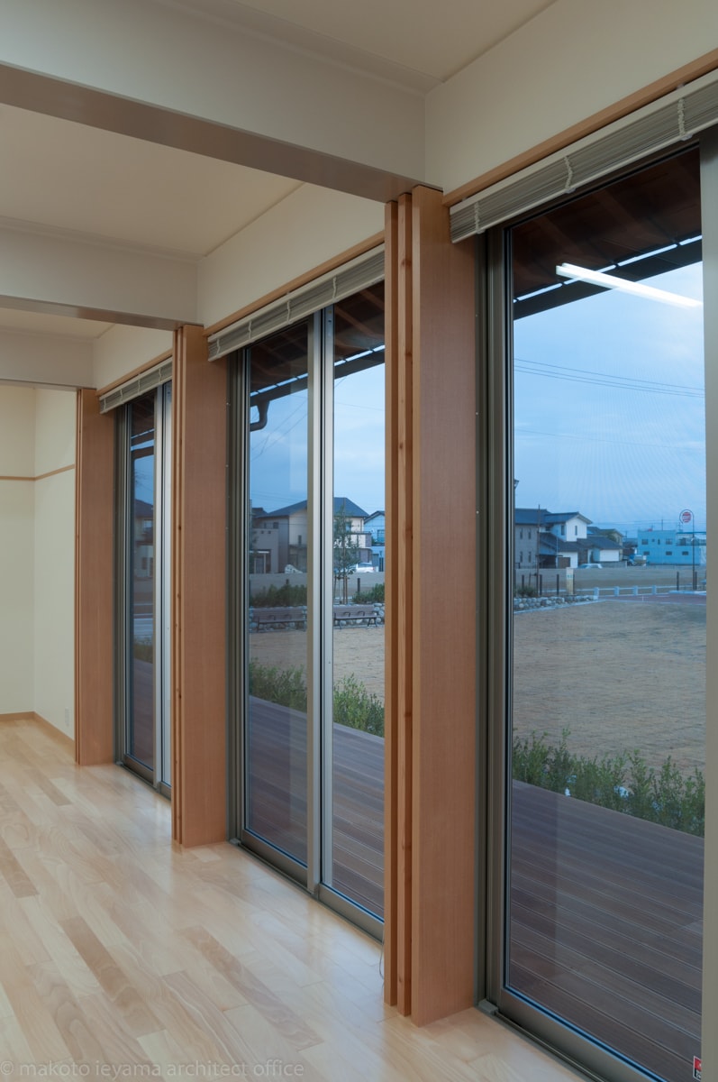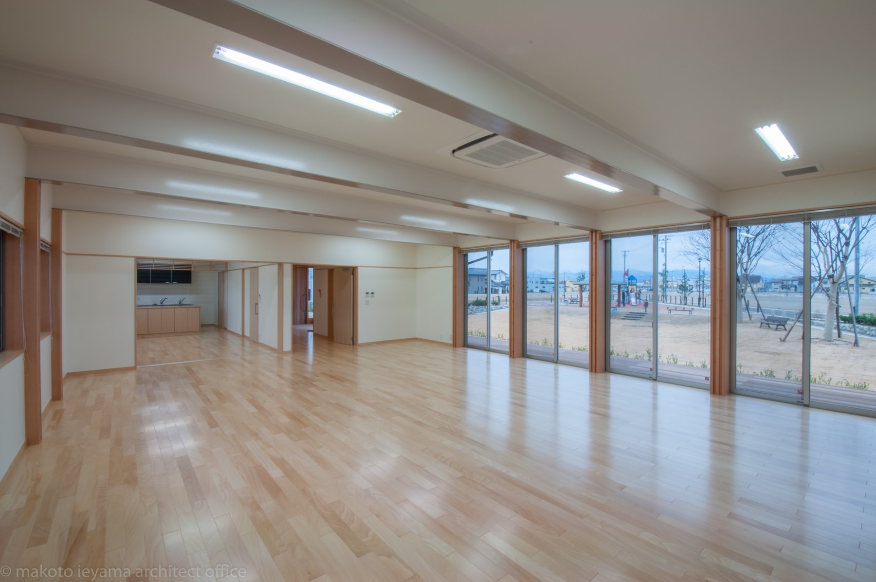 大会議室の左奥は連続する小会議室と台所。右奥は廊下。大きな空間を確保するために鉄骨梁(H鋼)による架構で4間(7.28m)のスパンを架け渡しています。南側は全て開口部となっておりウッドデッキを介して公園に視線が広がります。