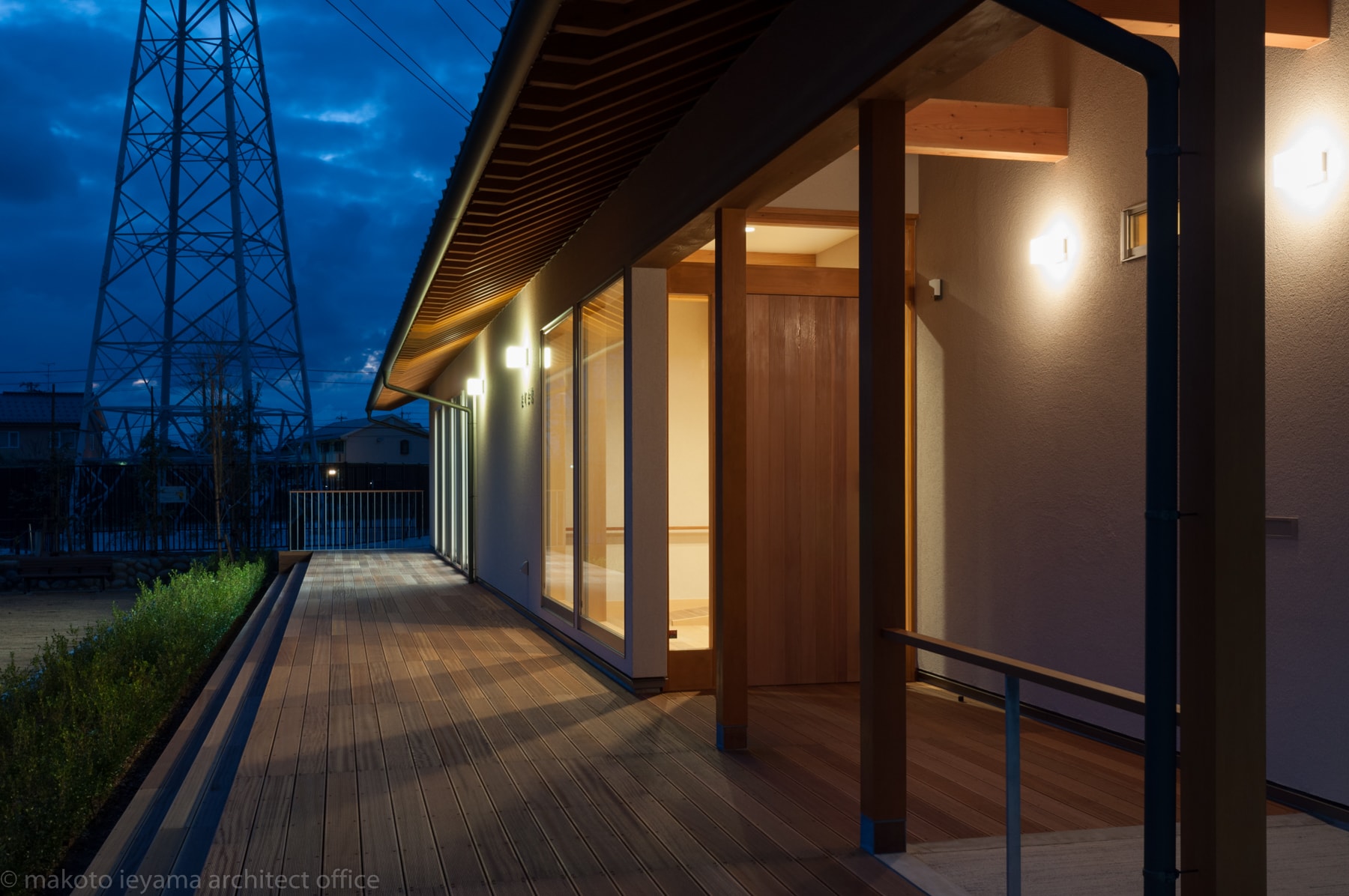 夜間は、1間(1.82m)ピッチの規則正しい開口部から灯りがもれます。玄関ポーチと軒裏の垂木のリズムを柔らかくライトアップするために、外壁には全方向に光が広がるブラケット照明を設置しています。