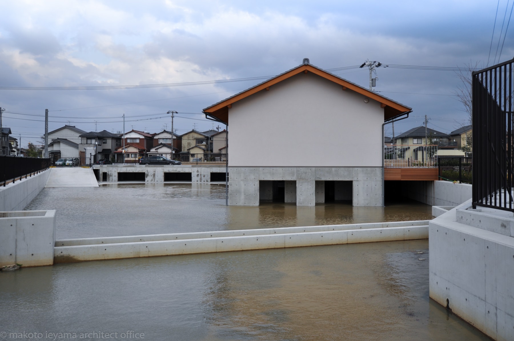 建物は調整池の上に建っています。右側が公園で建物との間をウッドデッキが橋のようにつないでいます。調整池の水位が上がっても鉄筋コンクリート造の高基礎で支えられています。建物奥正面は道路に面した調整池内の駐車スペースの人工地盤。
