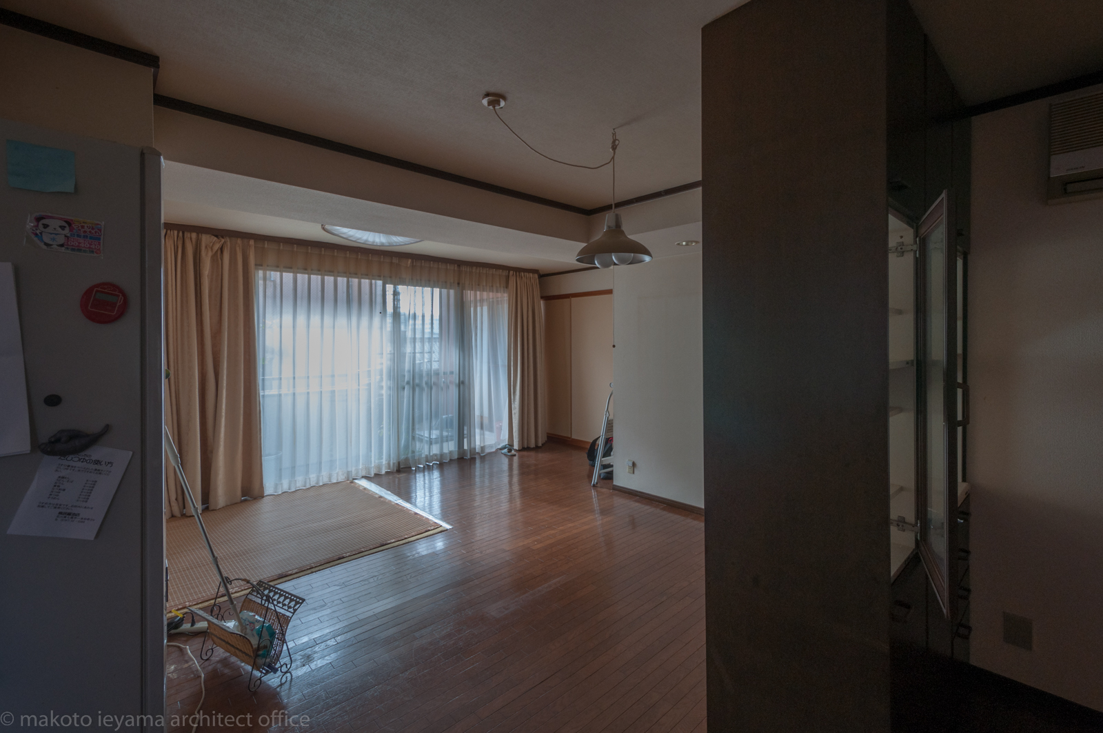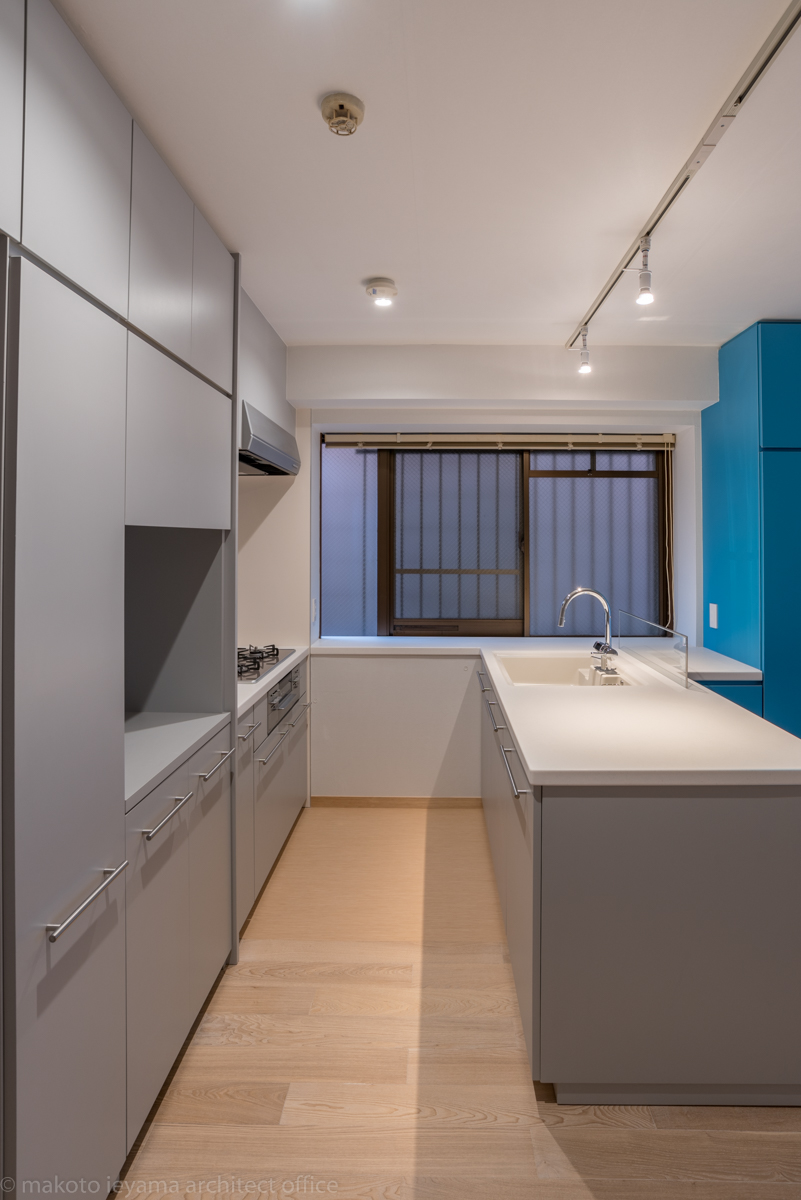 金沢市の浅野川に面する11階建てマンションの住戸のリノベーション。昭和60年代の景気の良い時期に建てられたマンションで、リビングの南面は大きな開口部、ドイツ製のシステムキッチン、部分的な床暖房などが備えられていたが、シングルガラスのアルミサッシによるコールドドラフト、窓面の結露により住環境は良いものでは無かった。重厚な色彩の造作材、室内に露出する柱型・梁型によって狭苦しい感じの空間を、明るくスッキリとさせ、収納を増やすことが求められた。