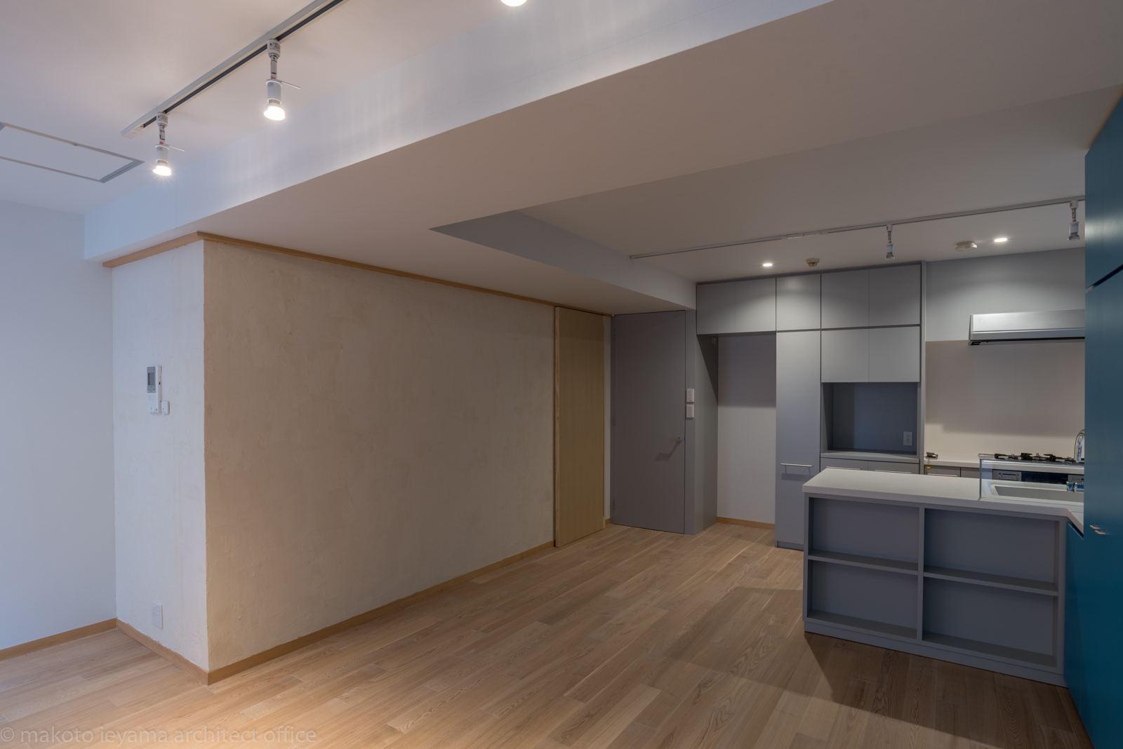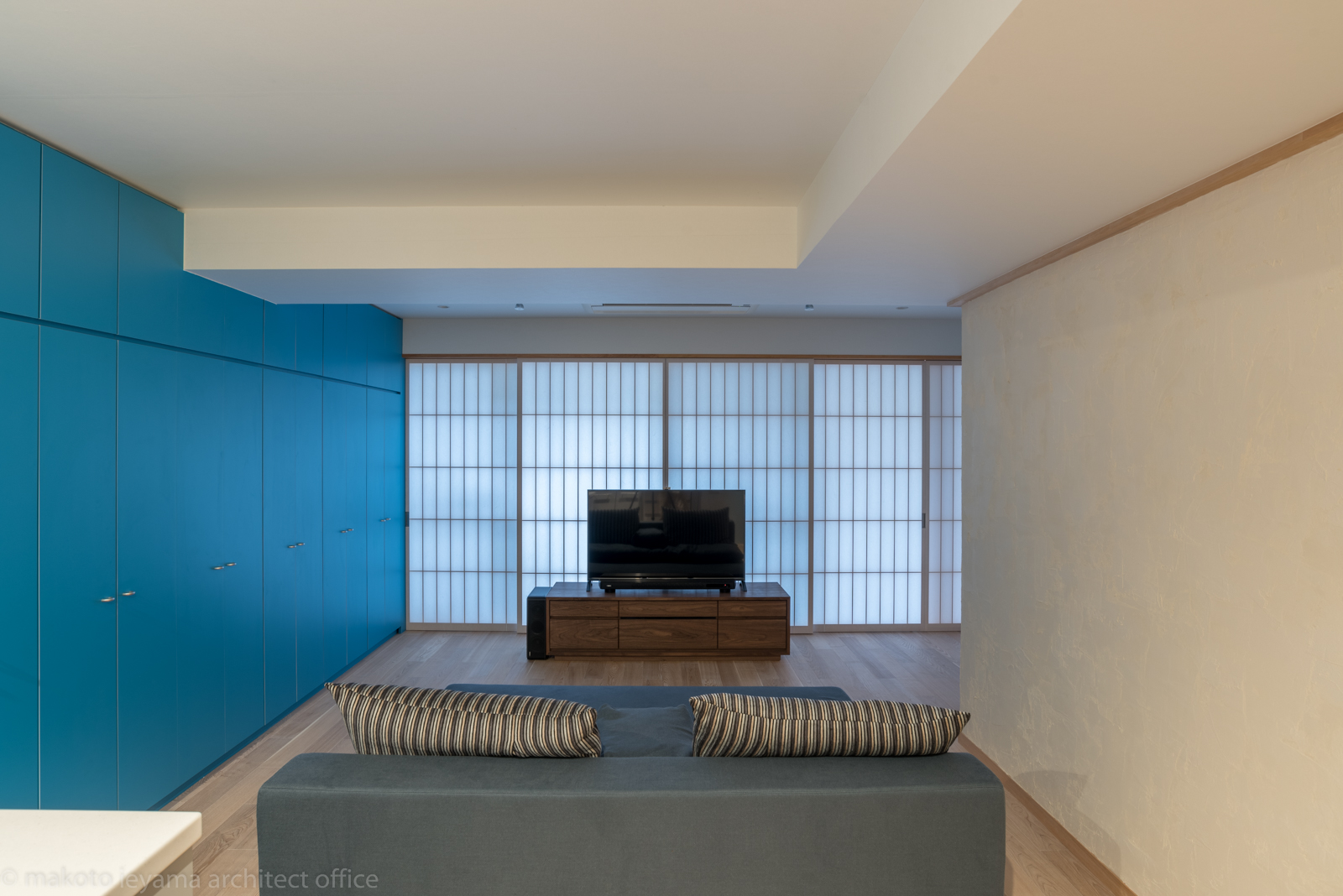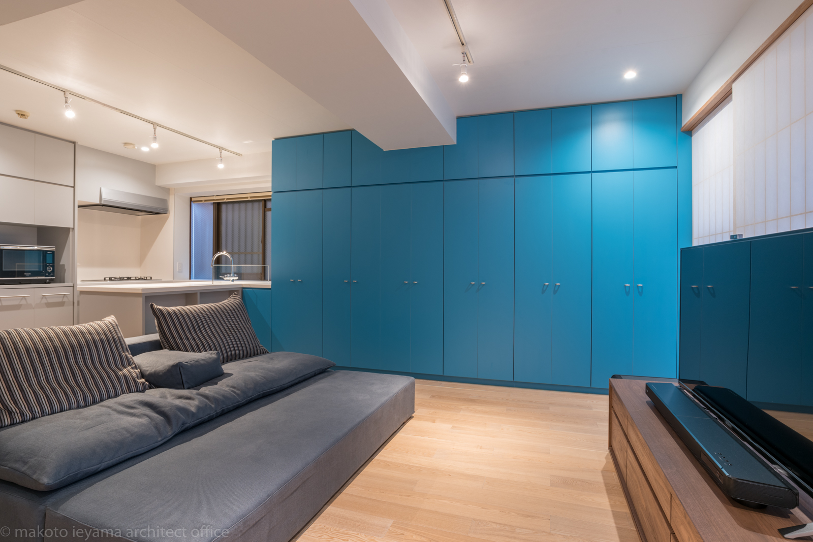 一方の壁面にはアクセントカラーの青色で天井いっぱいの収納家具を設け、室内に露出していた柱型を収納の内部に取り込んでフラットな壁面と大容量の収納になりました。既存の照明器具は撤去し、数カ所のダウンライトを埋込み、その他は配線ダクトによるフレキシブルな照明計画ができるようにしました。