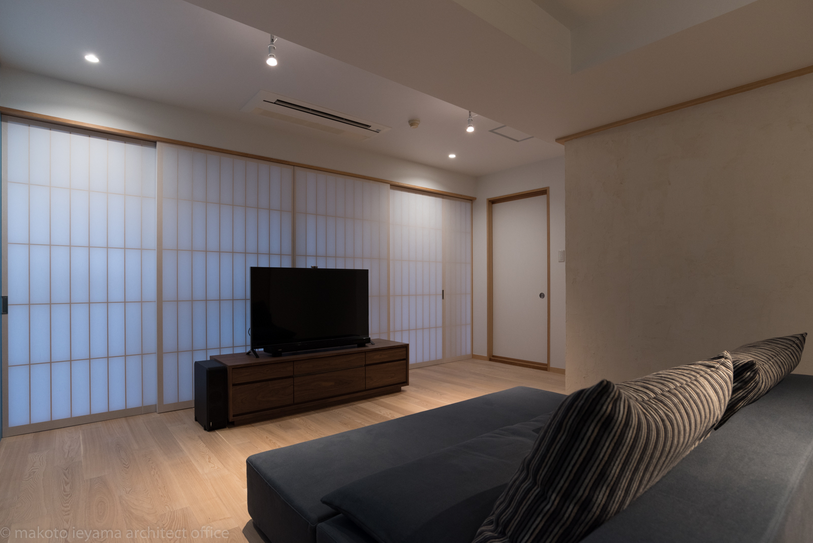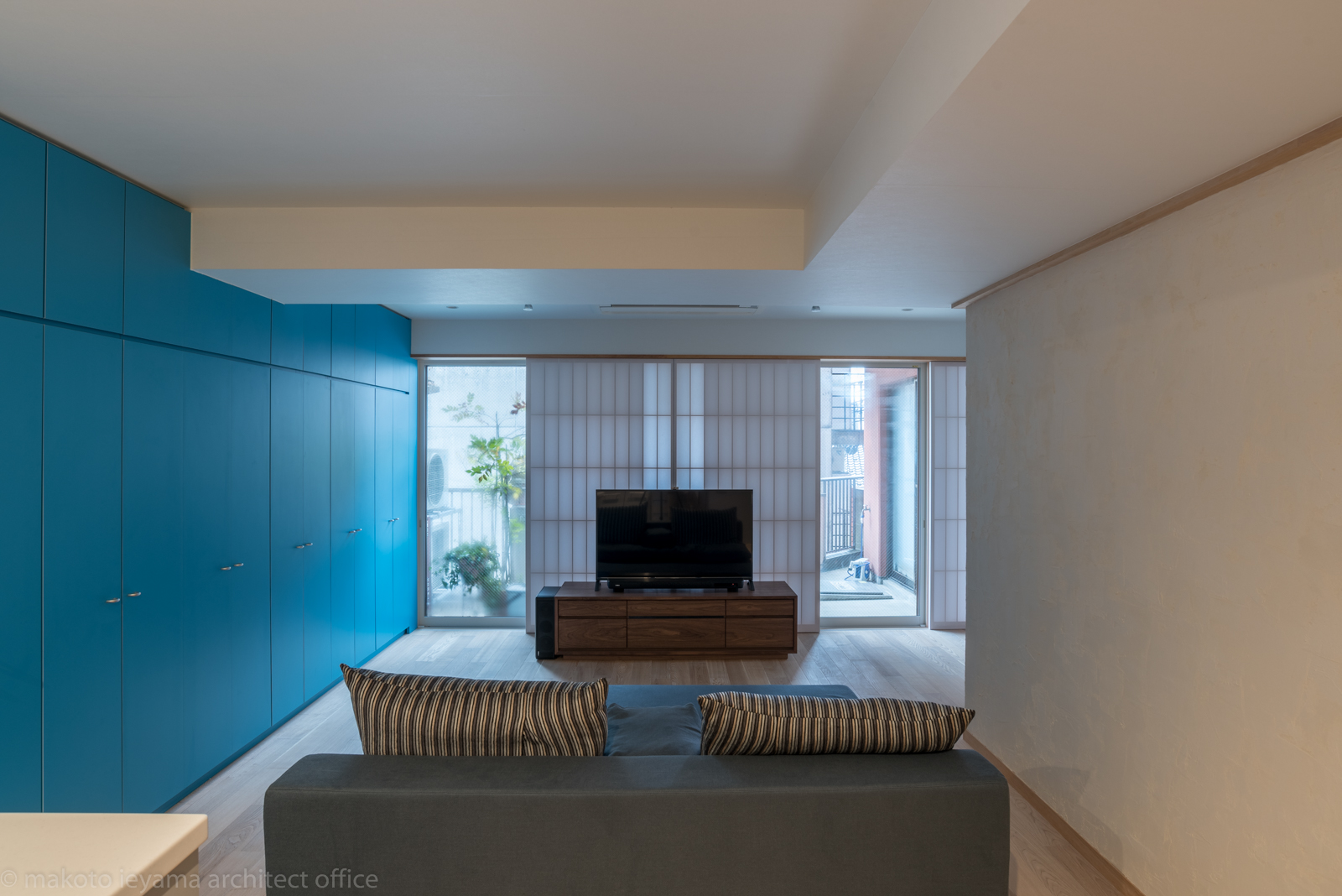 テレビの置いてある中央部分は、既存アルミサッシが嵌め殺しガラスになっているため、バルコニーへは両サイドから出入りします。中央の障子は開けてもガラスがあって出入りできませんが、ガラスの掃除などのメンテナンスのために開けることもできるようになっています。
