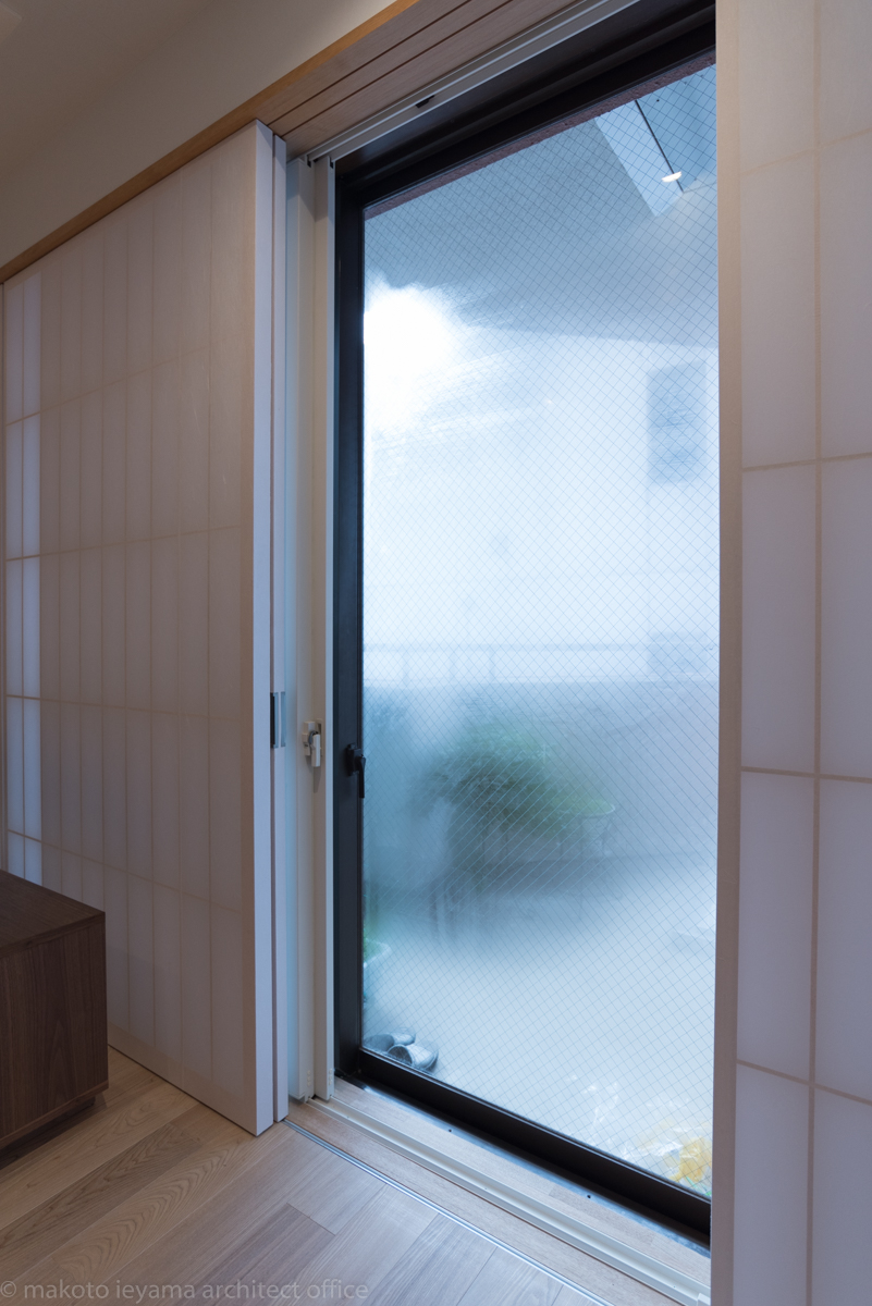 開口部は奥の方から、既存のアルミサッシ・樹脂製のインナーサッシ・太鼓張りの障子と三重構造になって、コールドドラフトを防止するようになっています。障子も桟の両側に紙を張る太鼓張りによって、外部の環境から室内を守ると共に、光の透過による見え方の変化を楽しむことができます。
