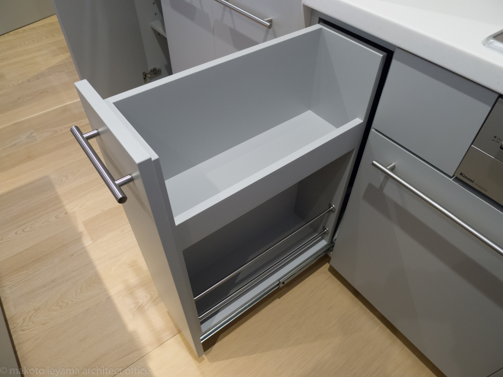 コンロ台にはスパイスラックとボトルラックの引出を設けています。分別ゴミを入れる容器も家具内に隠ぺいしています。