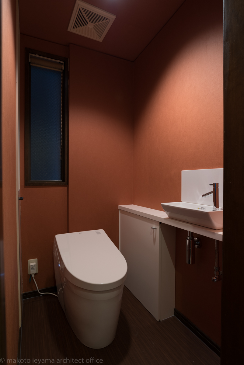 トイレは器具の取替と、手洗器を小さなカウンター収納と共に設置して掃除用具や予備のペーパーが収納できるようにしています。