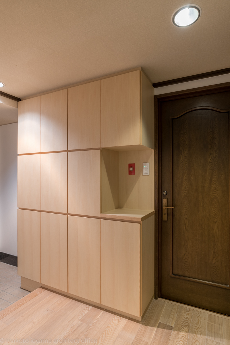 玄関の下足入は、ホワイトアッシュで天井いっぱいに造り付けました。マンションの防災機器のスイッチは位置を移動することができないので、扉一枚分の欠き込みをつくり小さなカウンターにしています。