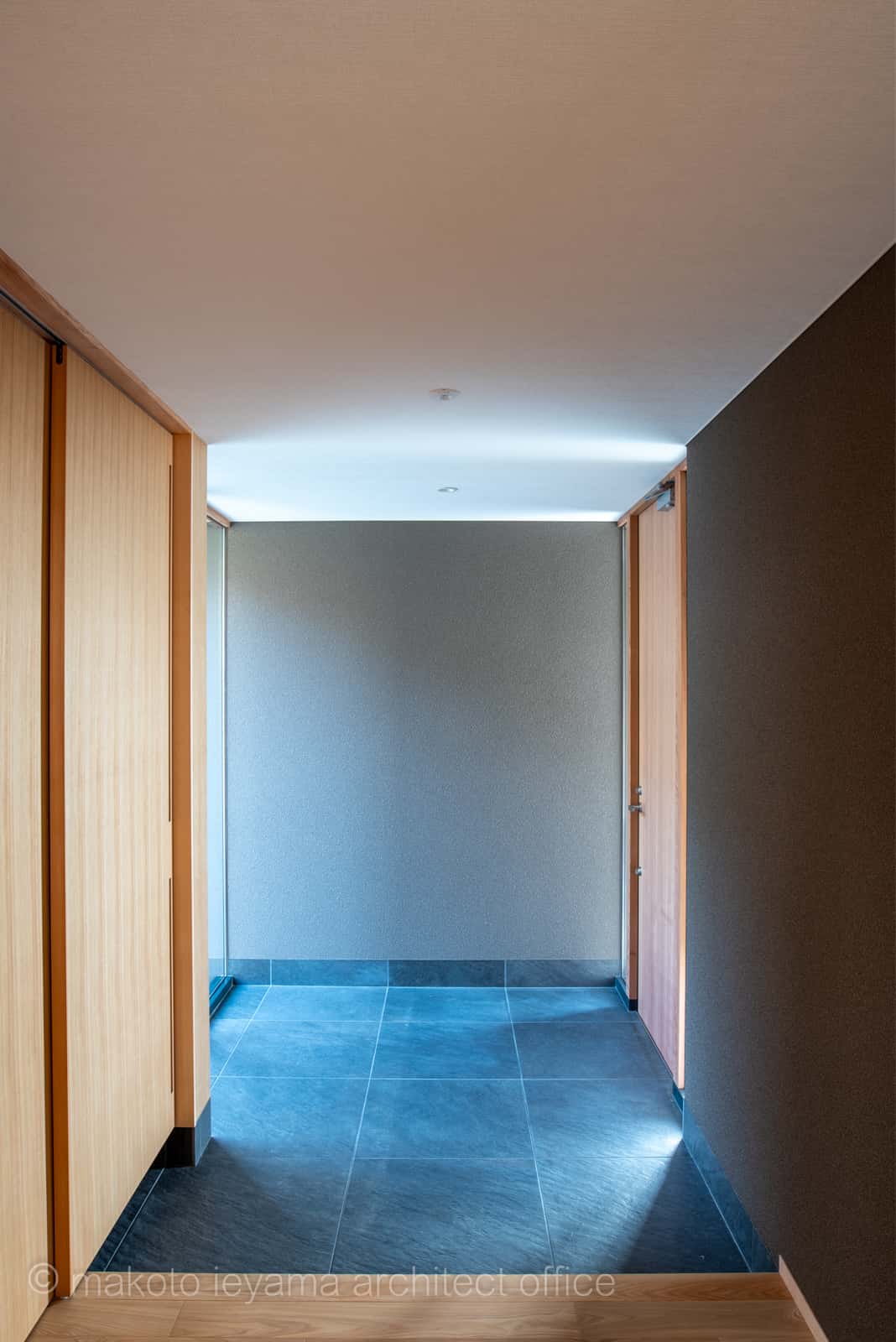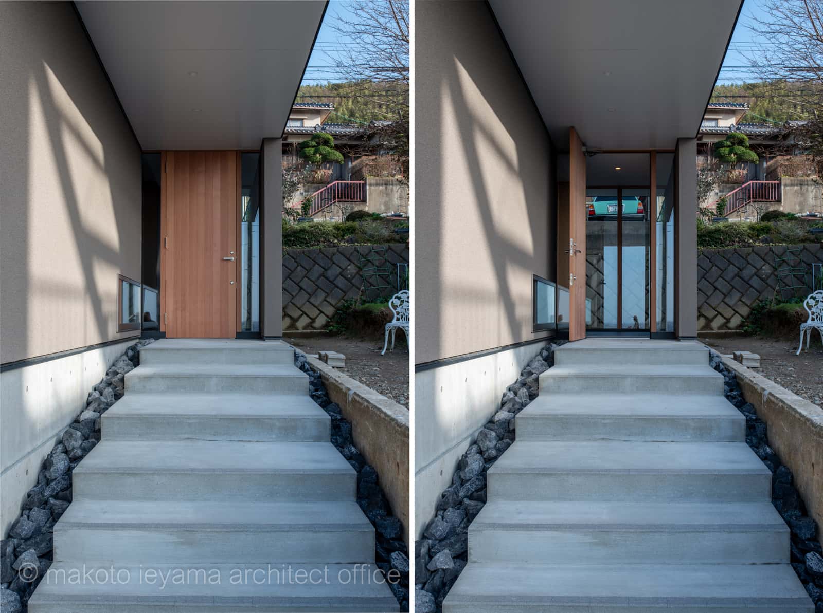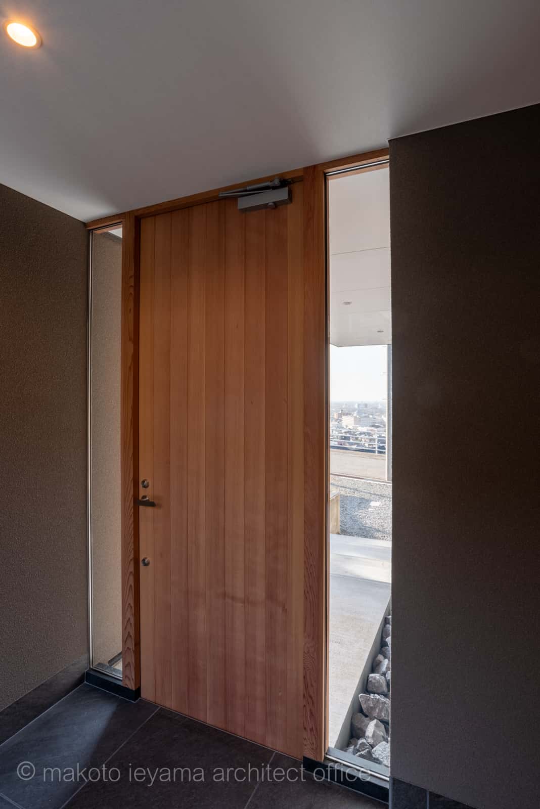 アプローチ階段の突き当たりに米杉板の木製玄関ドア。ドアの両端は透明ガラス(防犯ペアガラス)、ドアを開けるとその奥の裏庭側も透明ガラスで視線が抜ける半屋外的な場所となっています。階段両サイドは建物基礎、既存擁壁を縁を切るためスリットを開けて青葉石の砕石で埋めてあります。