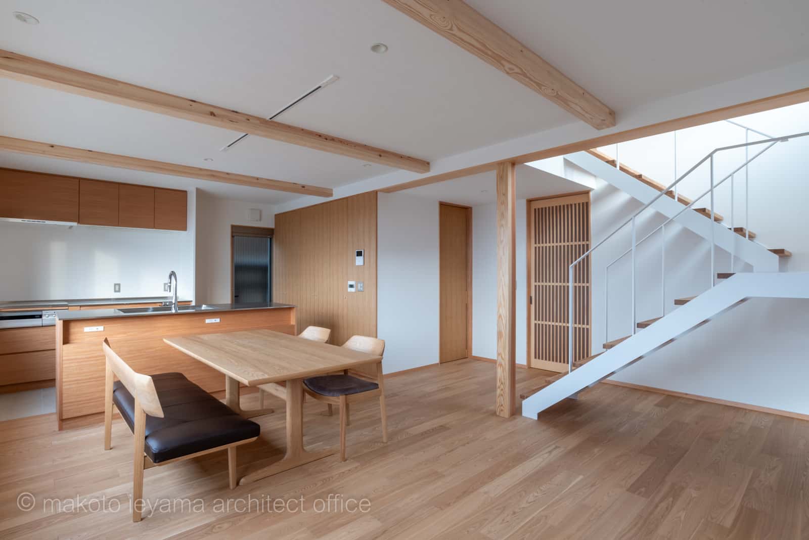 階段奥の格子戸は玄関ホールへ、階段下りた正面は洗面室に繋がります。キッチンの洗面室側の板壁はリビングとキッチンの収納棚ですが、扉を意識させないフラットな納まりとしています。 キッチンなどの造作家具、建具等はシルバーハートの練付合板で統一しています。
