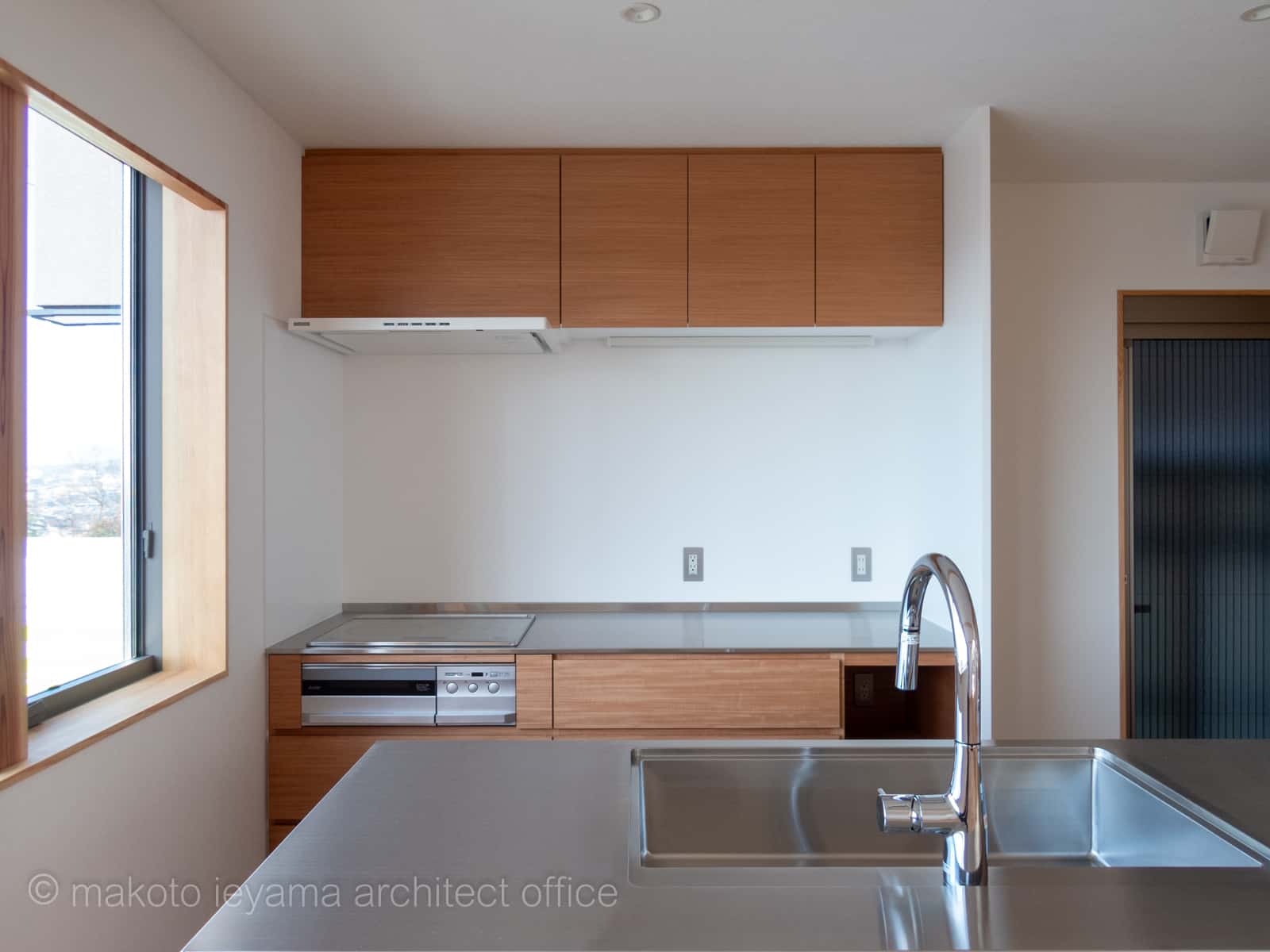 キッチンに立つと、階段下の小さな窓から玄関先を見ることができ、来客の気配を感じることができます。 左側の木製パネルは収納棚。分電盤やwi-fiルーターなどもこの中に設置してあります。
