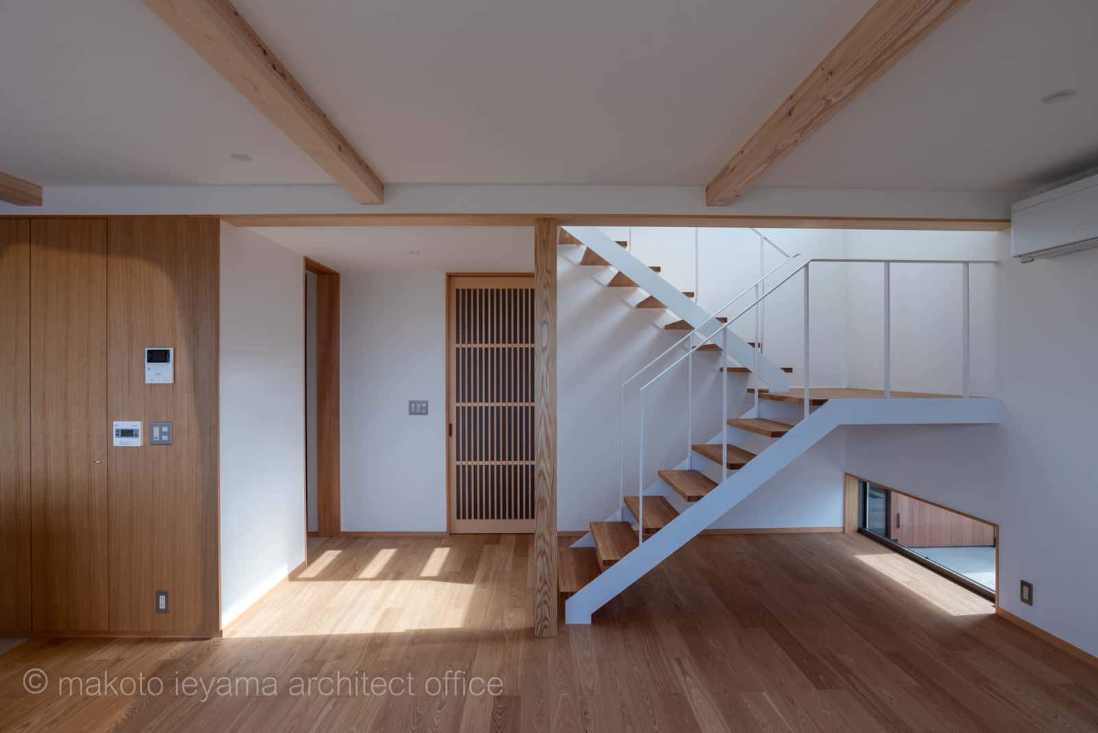 周囲には眺望に対して大きな開口部を設けた住宅が多く建っているが、落ち着いた居住空間にし、前面道路側の架空電線を視界に入らないようにするため、上下方向の開口部位置をコントロールした。