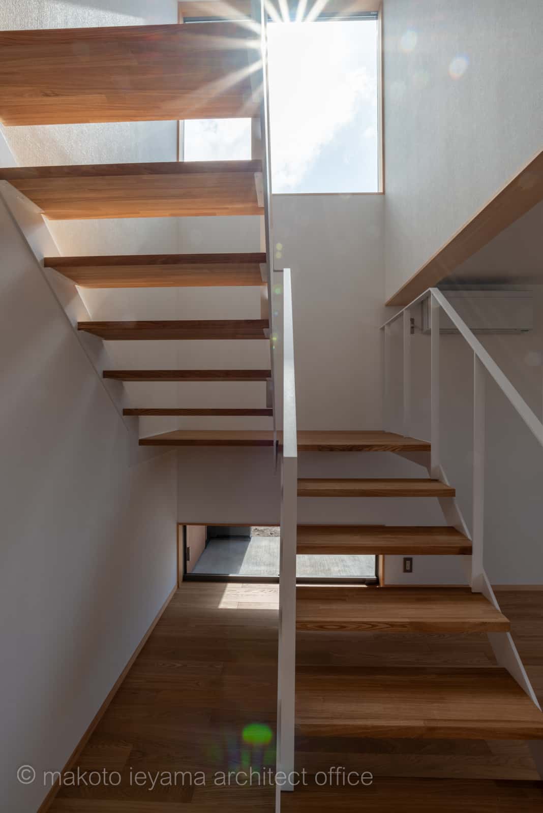 階段下部には玄関先の気配を感じる窓。上部には階段吹抜からの採光のための大きな窓があります。