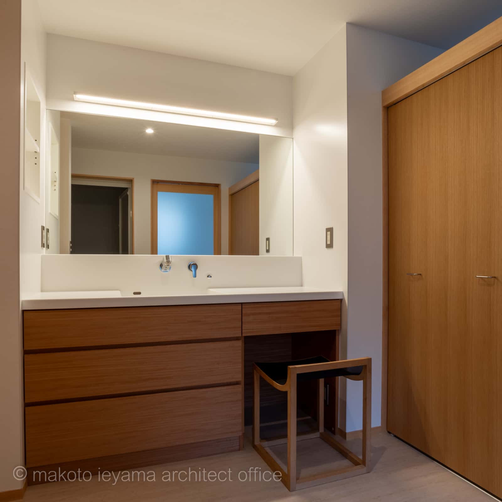 洗面脱衣室には化粧コーナーを兼ねた人造大理石の造作シンクを設けています。鏡は壁の幅いっぱいに設け、左側の壁埋込収納とカウンター引出に洗面・化粧用品を収納しています。右側にはクロゼットを設け、隣接する洗濯室からの収納、浴室を出た後の着替えなど、ここで完結するようにしています。