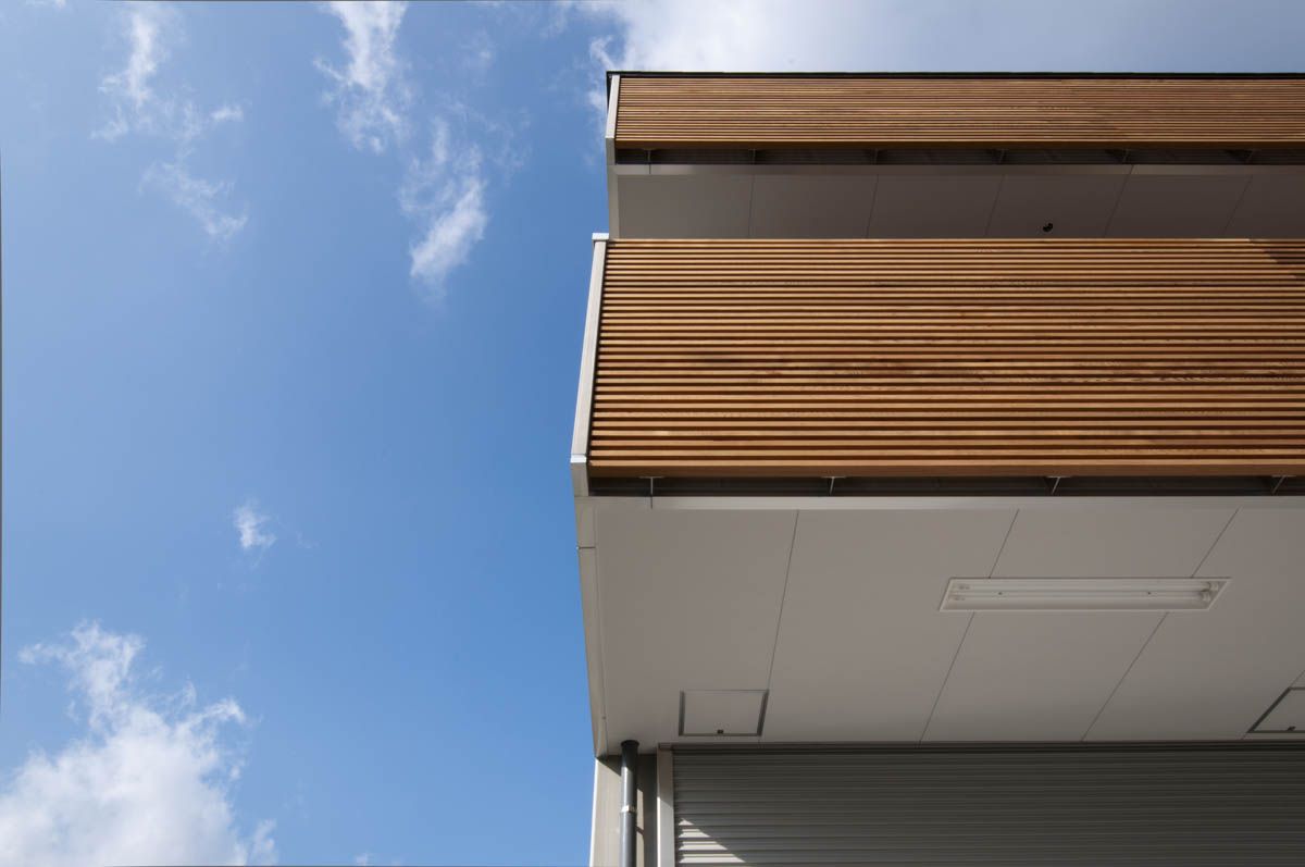 シャッターの並ぶ1階の工場に対して、2階には米杉のバルコニー格子で住宅らしさを表現しています。格子は、正面から取付金物が見えないように工夫をして、両サイドも押出成形セメント板の厚み(6センチ)だけが見える納まりとしています。