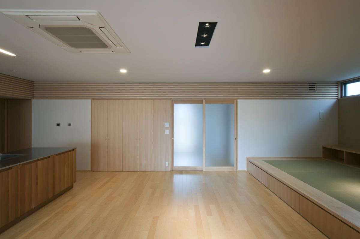 35帖のリビングにはアイランド型キッチンと畳コーナーを配置。畳コーナーの下は引出式の収納になっています。