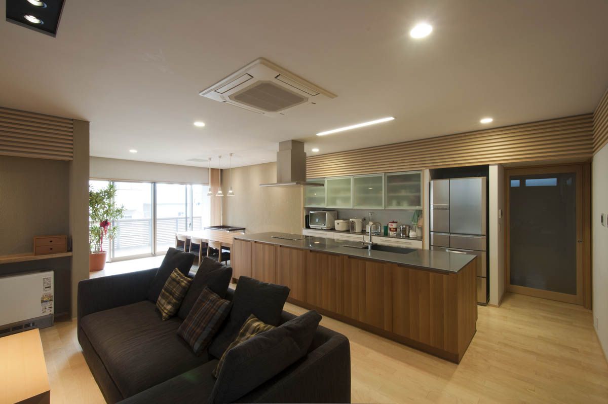 リビング側からキッチンを見ると、アイランドキッチンの背面には冷蔵庫と食器棚、家電置場が壁面に埋め込まれ、室内に物があふれてこないようになっています。右側のガラス戸はプライベートルームへと繋がる出入口です。
