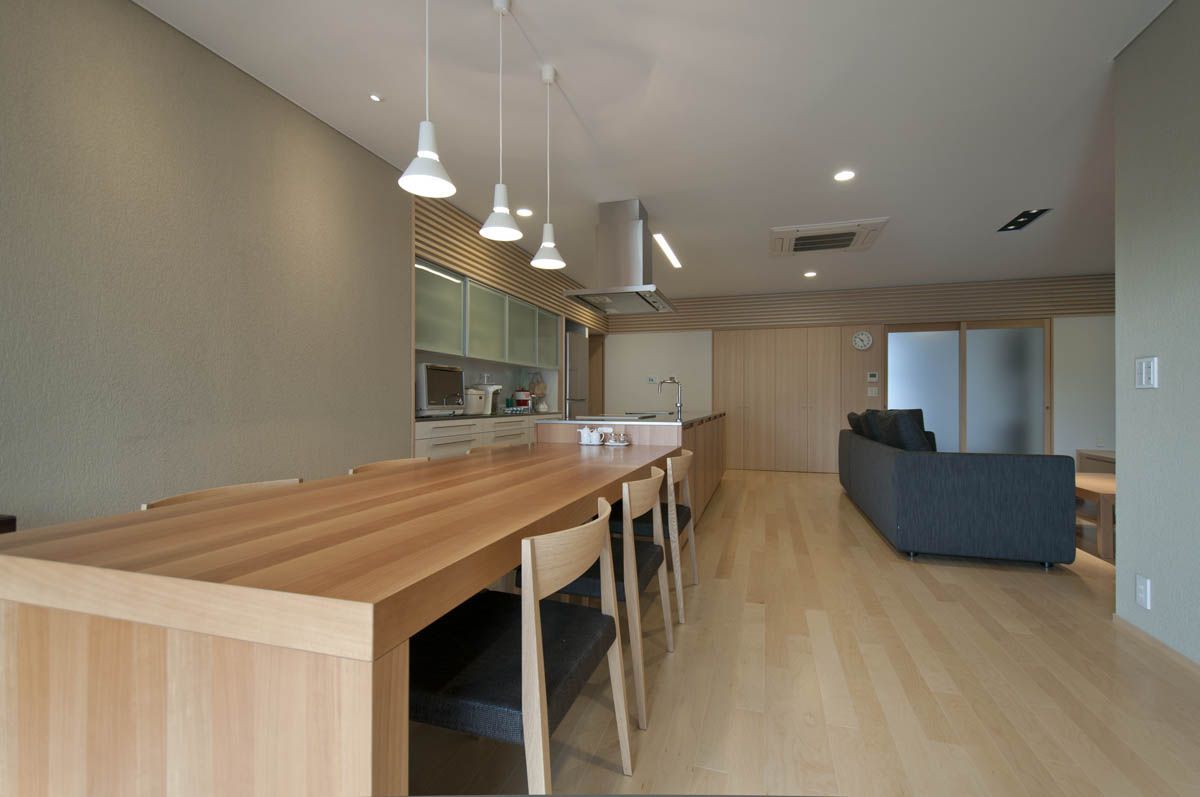 3.6mの流し台と2.5mのテーブルを連続させた長さ6.1mのユーロモビル(Euromobil)のアイランド型キッチンが生活の中心の場となります。
