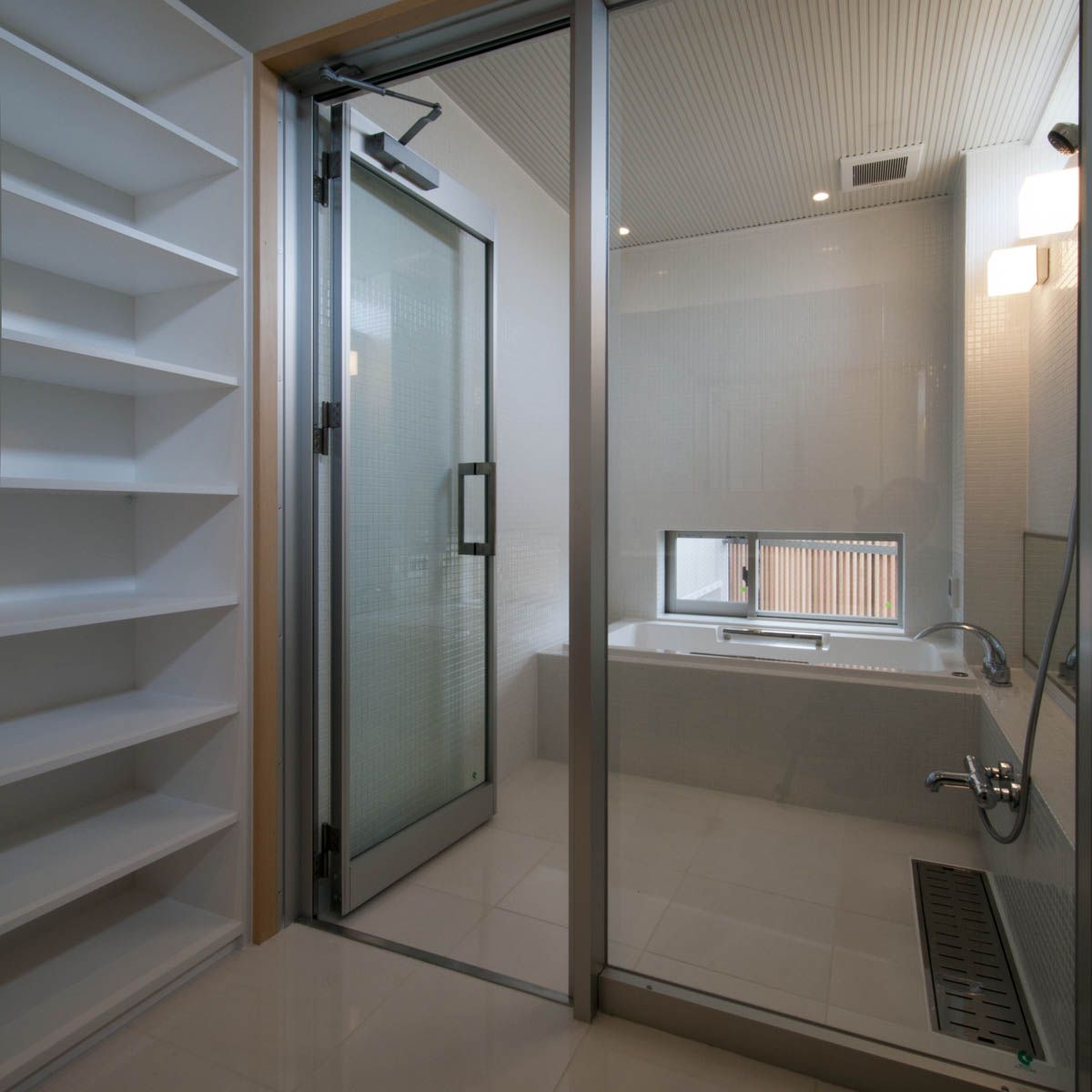 強化ガラスで仕切られた浴室は、洗面室と同じ大理石の床が連続します。浴槽の奥に小さな坪庭(プライベートなバルコニー)があります。