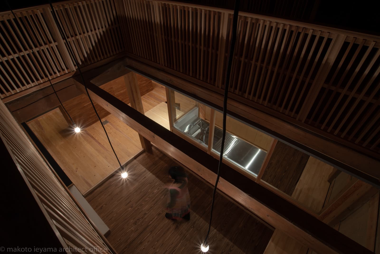 2階から吹抜を通してショップスペースを見下ろす。濃色の床面がショップスペース、白木の床面が工房スペース、ガラスのスクリーンで仕切られた部分がキッチン。ショップの照明は吹抜上部から吊るしたモーガルソケットにクリア球の白熱灯(裸電球)です。