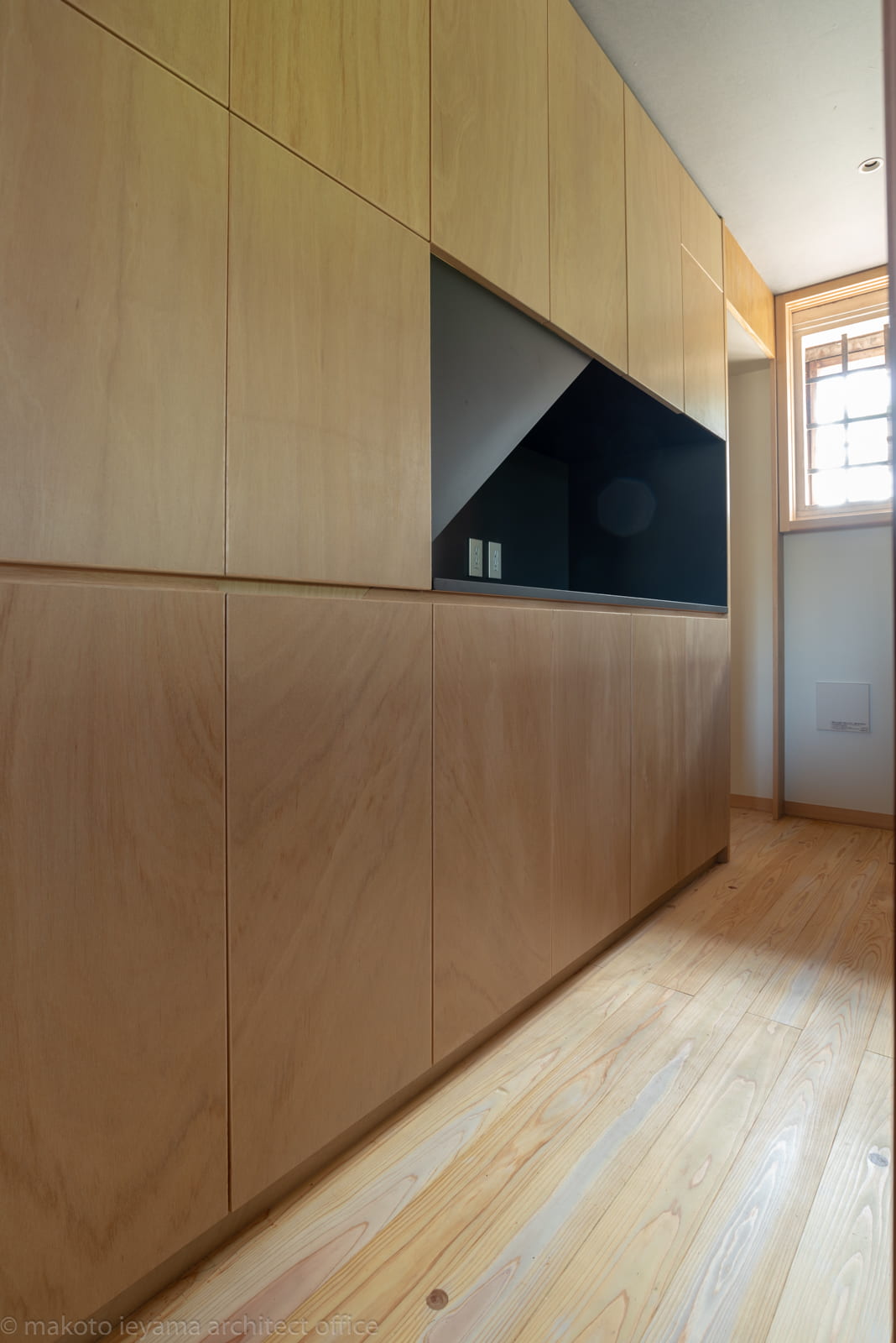 キッチンの背面にある階段の下部のみ収納になっているが、階段が空間を斜めに横断し見えることによって存在感が大きくなるために、壁面全体をラワン合板の収納扉で割付けて覆い隠しています。電子レンジなどの電置場もなるべく幅を確保するために一部階段の斜めのラインが出てきましたが、黒色のメラミン化粧板で矩形に区切り見え方を調整しています。