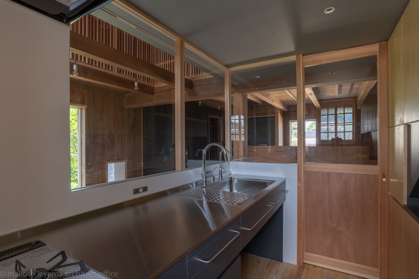 ガラスで囲まれたキッチンは、工房の埃が入らないようにするためと、製作と生活の場が一体となった空間のため、緩やかに区切るために設けてあります。