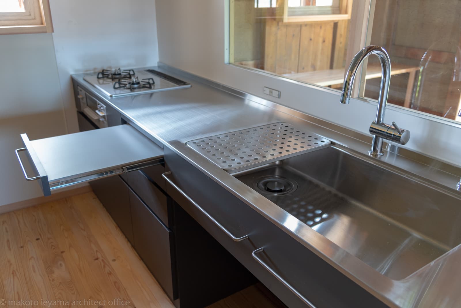 キッチンは、使い手のオーダーに応えて、シンクの位置や大きさを検討し、引出しなどの収納も配置。シンクとコンロの間に引出式の作業台を設け、一時的な配膳スペースとして利用します。オーダーキッチンでは、既製品に無いわがままにも応えられます。