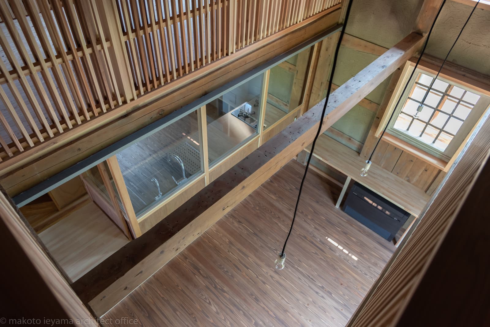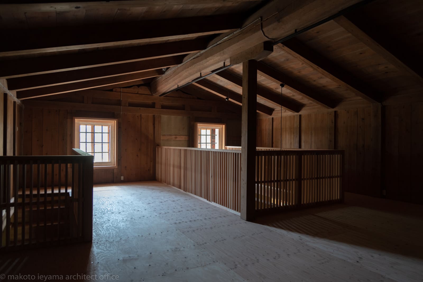 2階は既存床板の上に構造用合板を張り、床の剛性を高めることと、1階に床板の隙間から埃が落ちないようにしています。階段と吹抜には杉材の格子で手摺を設けています。