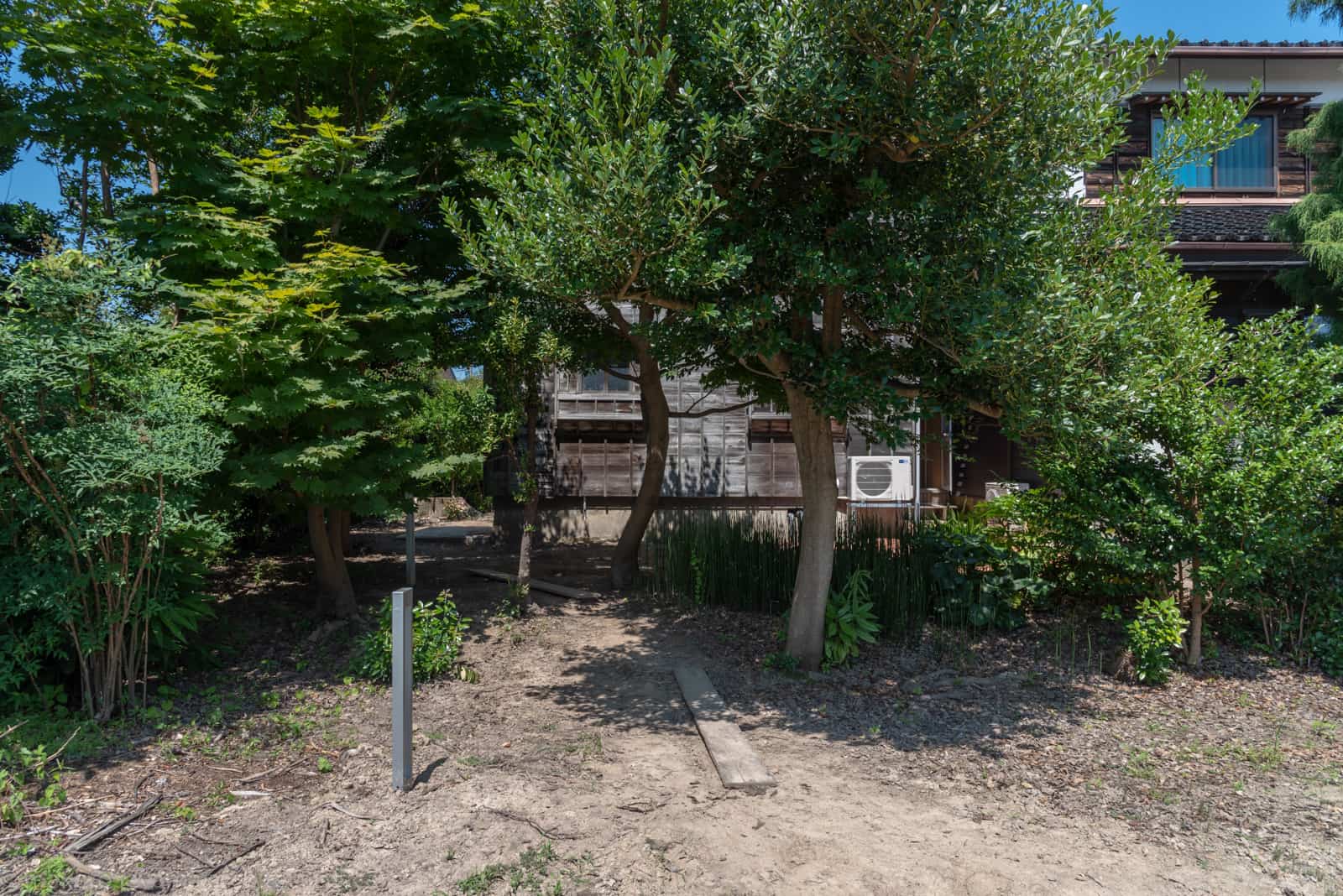 敷地の一番奥に位置する土蔵は、駐車場となるオープンスペースから庭の木々の間をかいくぐってアプローチします。土蔵の入口までの誘導として庭園灯を設置してありますが、アプローチ空間はクライアントの手によって少しずつ進められる予定です。