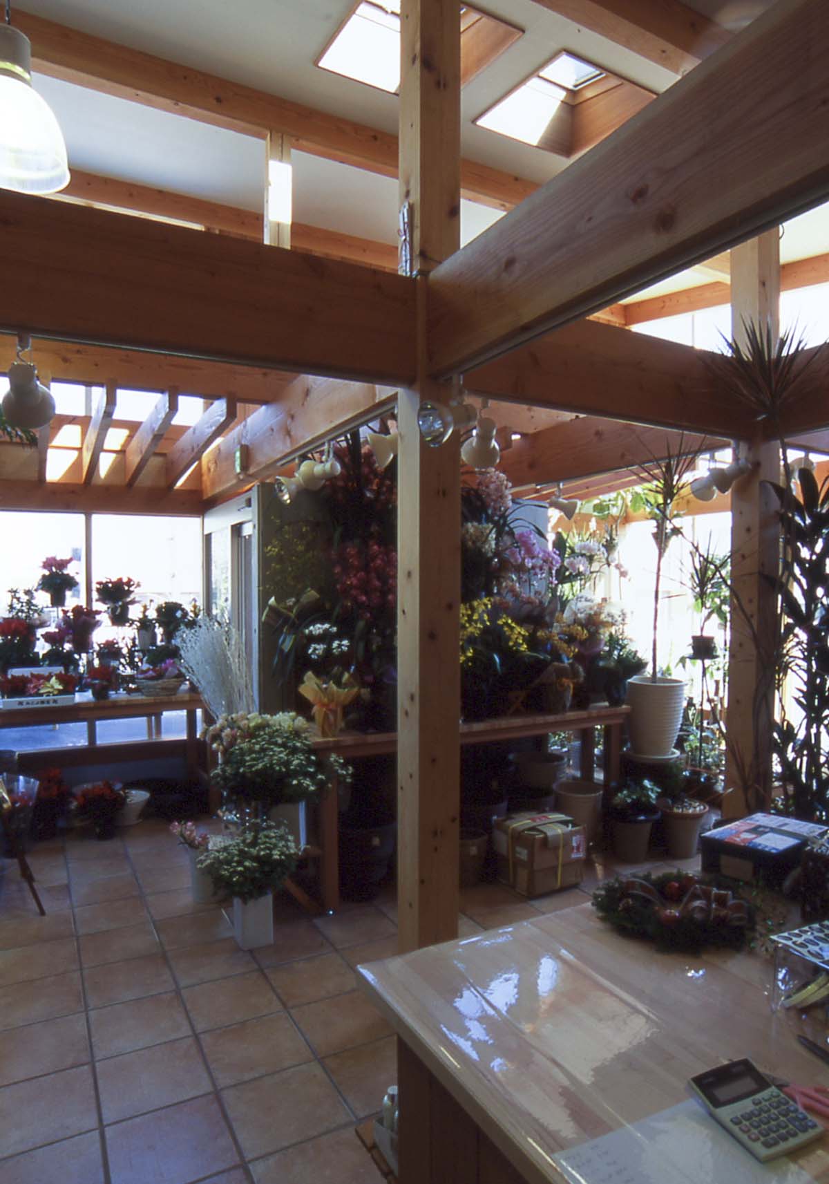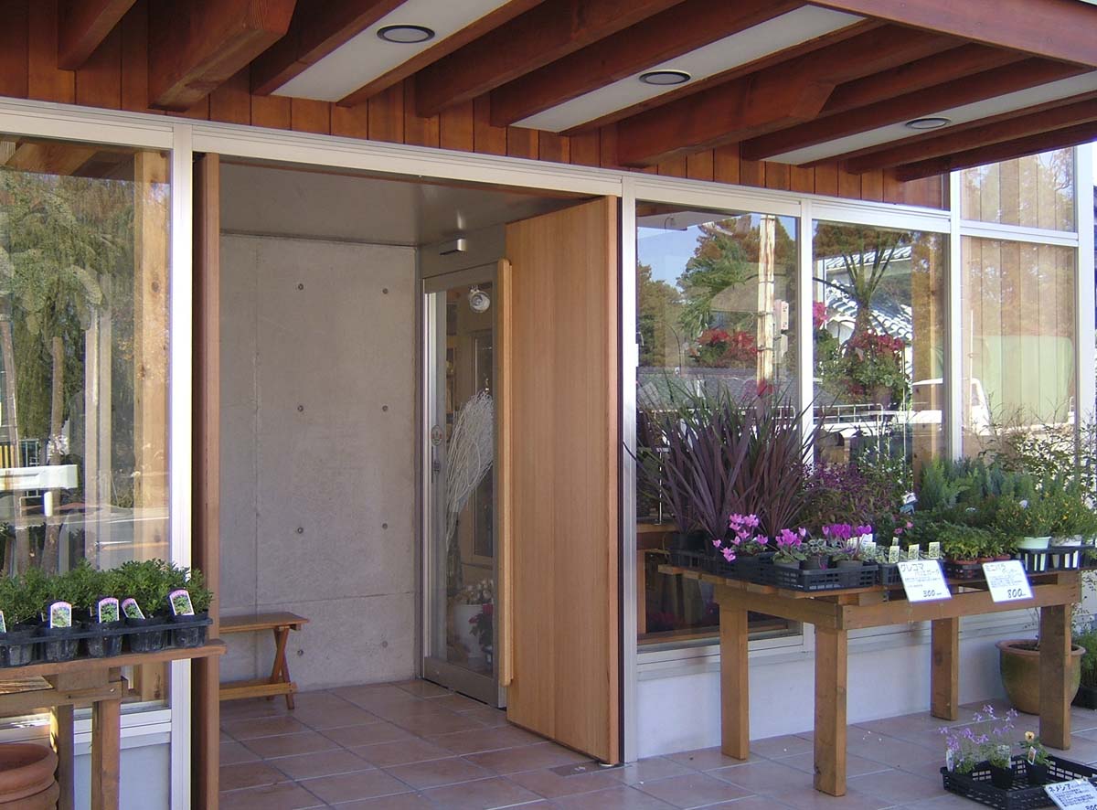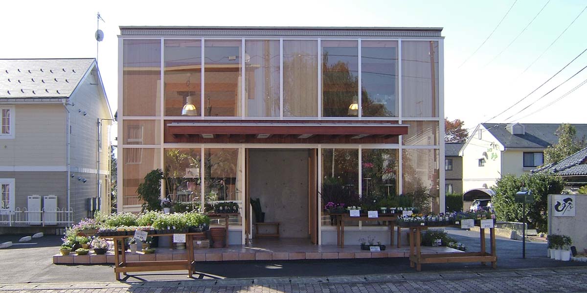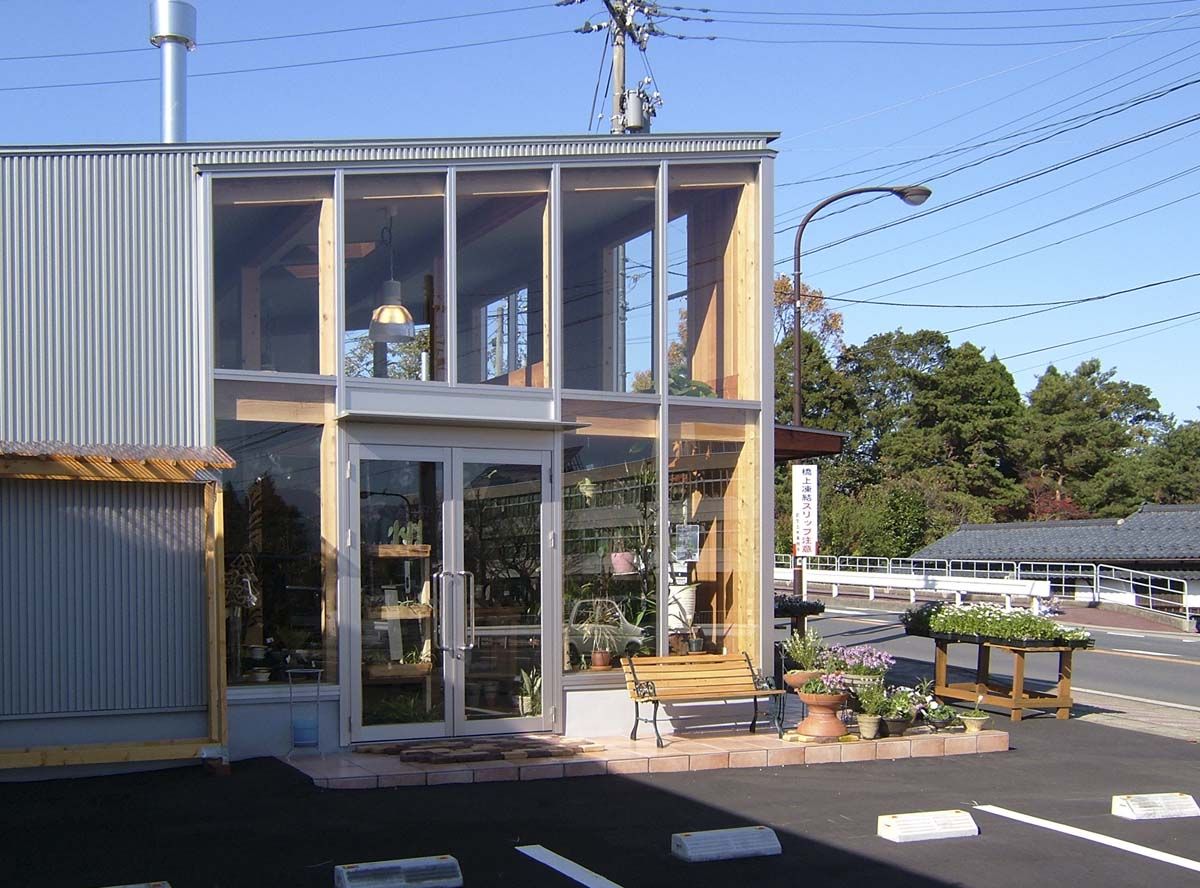 既存のフラワーショップの建替え。フラワーアレンジメント教室や薪ストーブの展示販売を行う生活提案型のフラワーショップ。