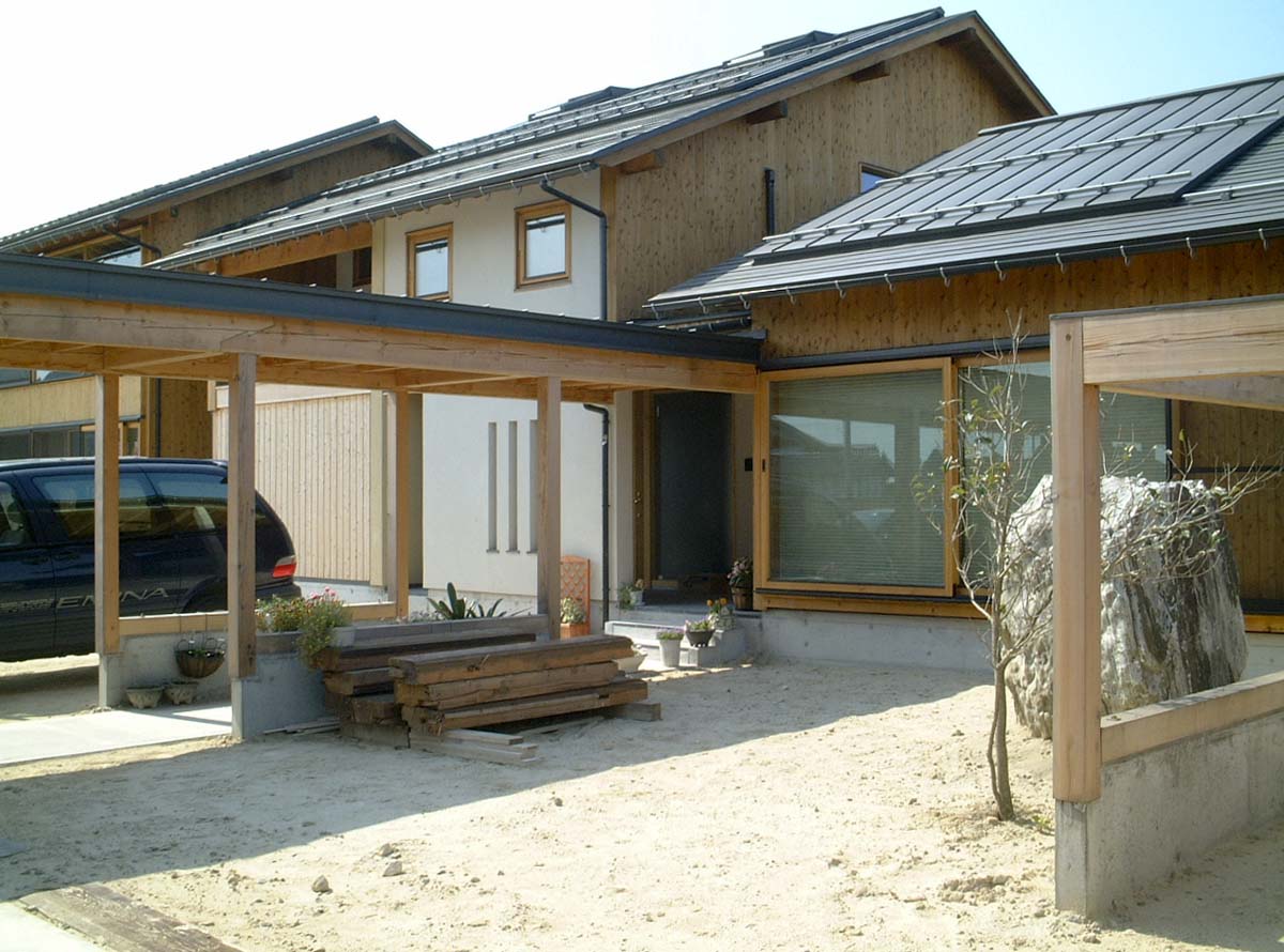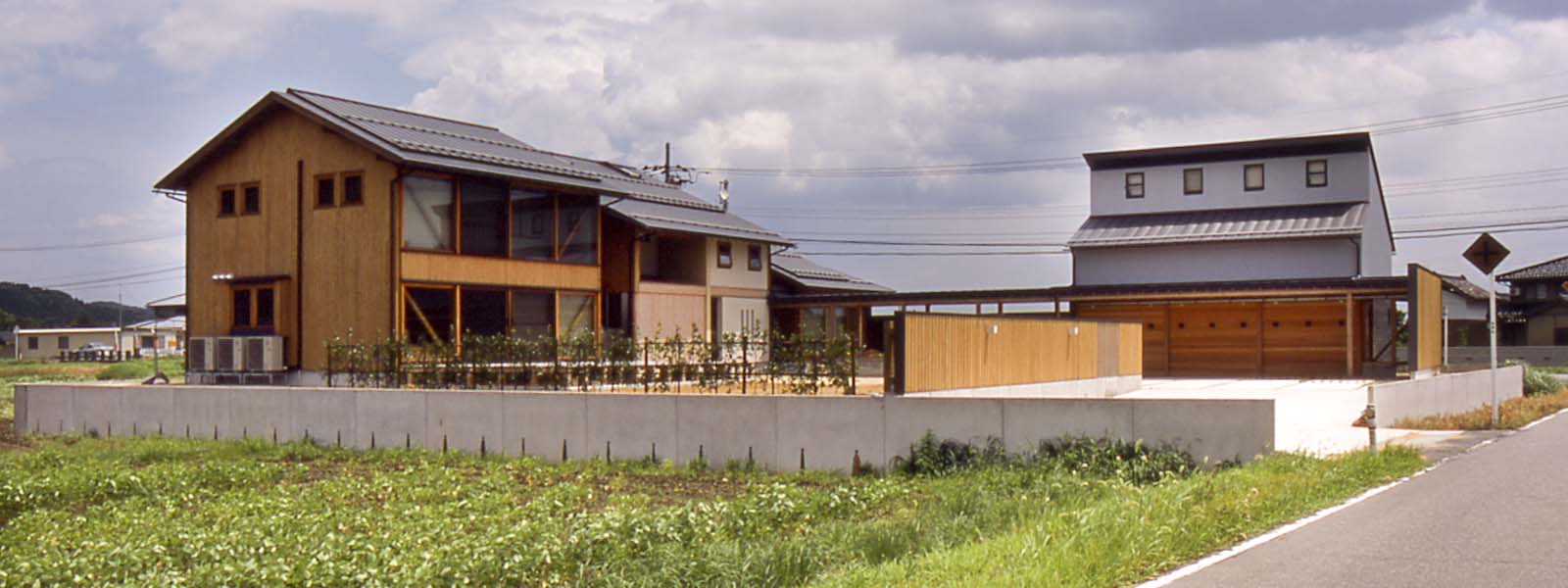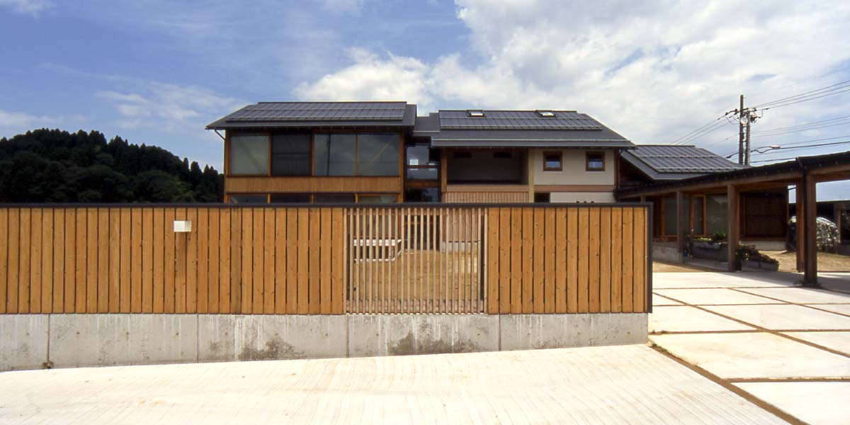 散居村の風景が残るこの周辺は、県道拡幅による住宅の建替えが進んでいる。敷地は拡幅予定の県道と町道の交差点に位置するため交通量の増加が予想された。敷地と道路を仕切ると共に近隣に開かれた田園のライフスタイル、同居する母親と子世帯の適度な独立性、家族の成長にあわせて変化する家、従前と同等の面積(85坪)をとりながらも明るい居住空間が求められた。