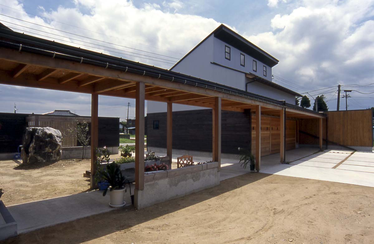 住宅棟の母屋と納屋は屋根のある回廊でつながれています。回廊の屋根は納屋の庇と連続し、天候の悪いときでも行き来がしやすくなっています。