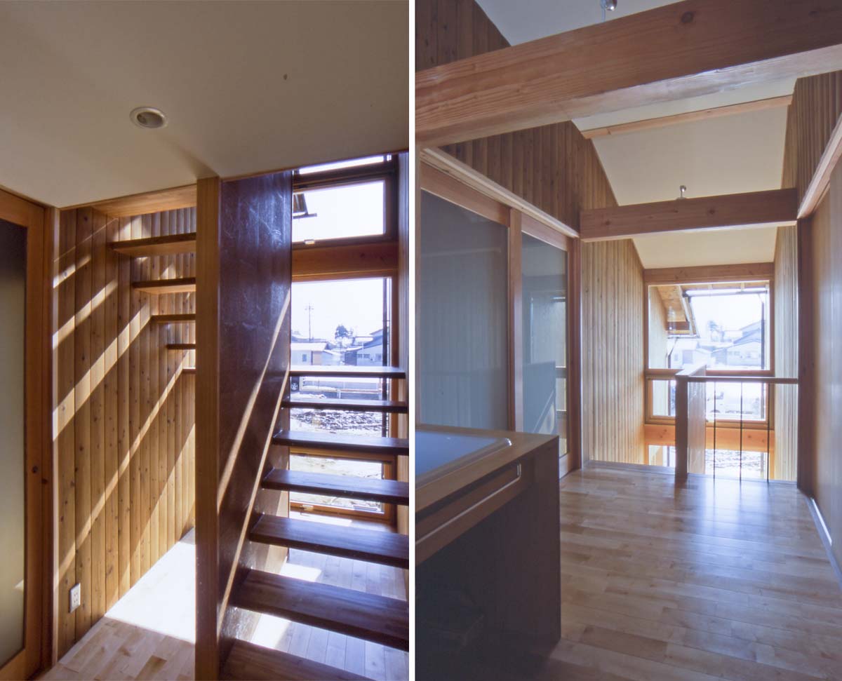2つの建物ボリュームの隙間が階段となっています。外壁の杉板張りが室内まで貫通し、ガラス張りの窓が内外を連続させています。