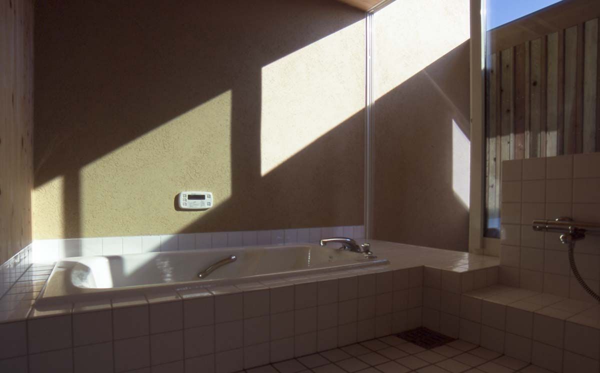 浴室は坪庭に面し、南側はアルミサッシの全面開口になっています。外部のマヂックコート塗の外壁が浴室内部までつながり内外の連続性を高めています。