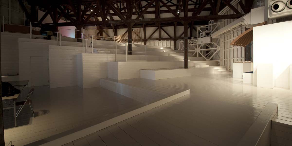 アート工房の低いスロープを上がったところのエアコン置場(写真右側)にトライウォール(強化段ボール)のルーバーで曲面屋根を架けて待合としています。階段状の会場の最上部に茶室空間があります。