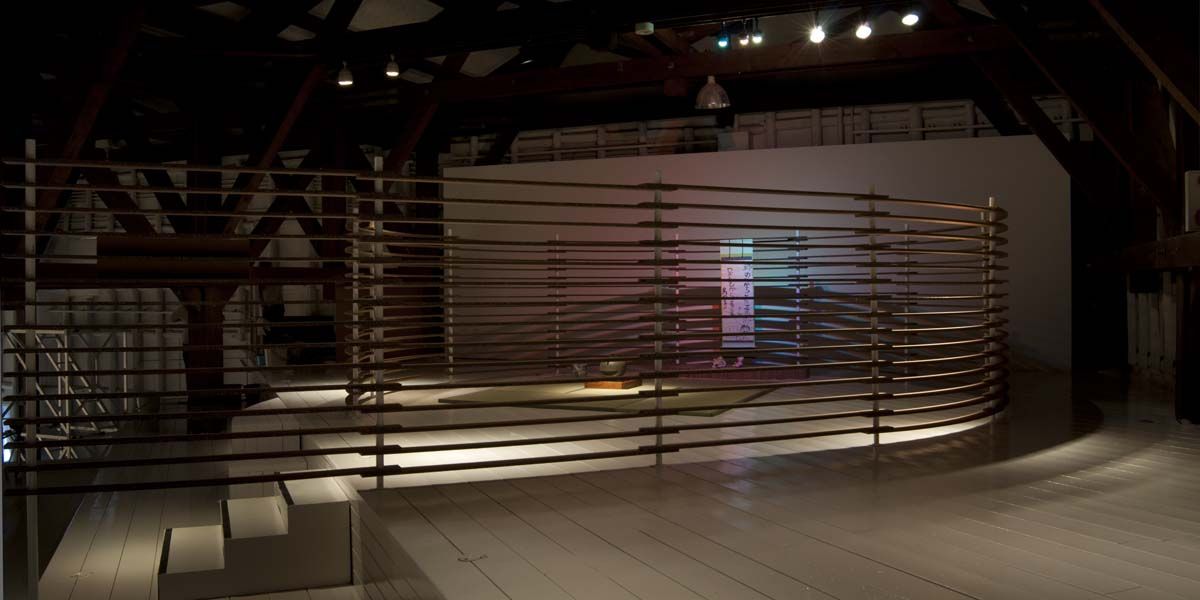 囲まれた茶室空間の周辺を露地空間に見立て、そこから茶室へと誘導されます。上部より光の三原色(赤・緑・青)のカラーダイクロハロゲンで格子を照らし、カラーシャドウによる茶室周辺の露地空間を演出しました。