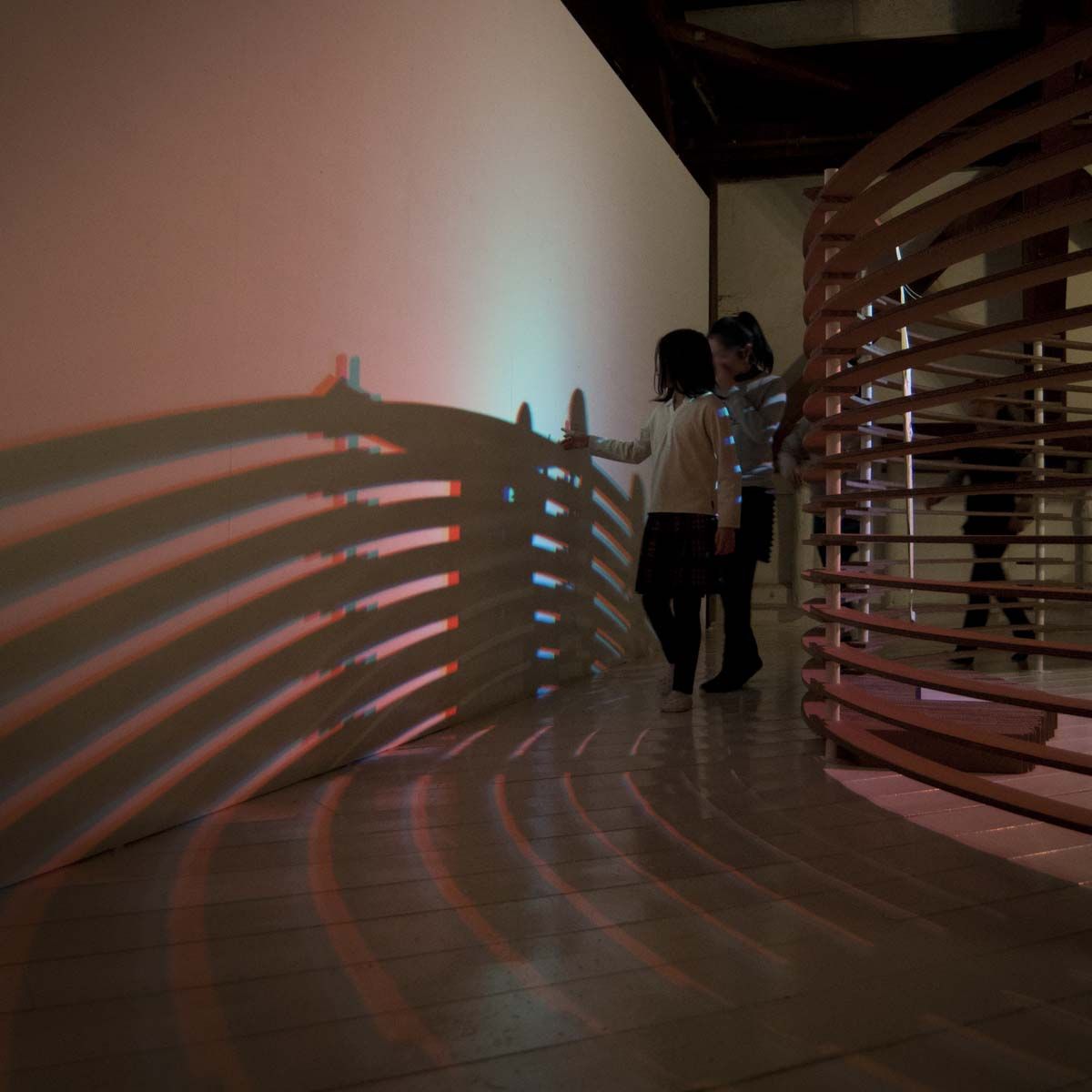 トライウォール(強化段ボール)のルーバーを組み立て、茶室空間をつくりだす。カラーダイクロハロゲンによるカラーシャドウによって茶室周辺の露地空間を演出。