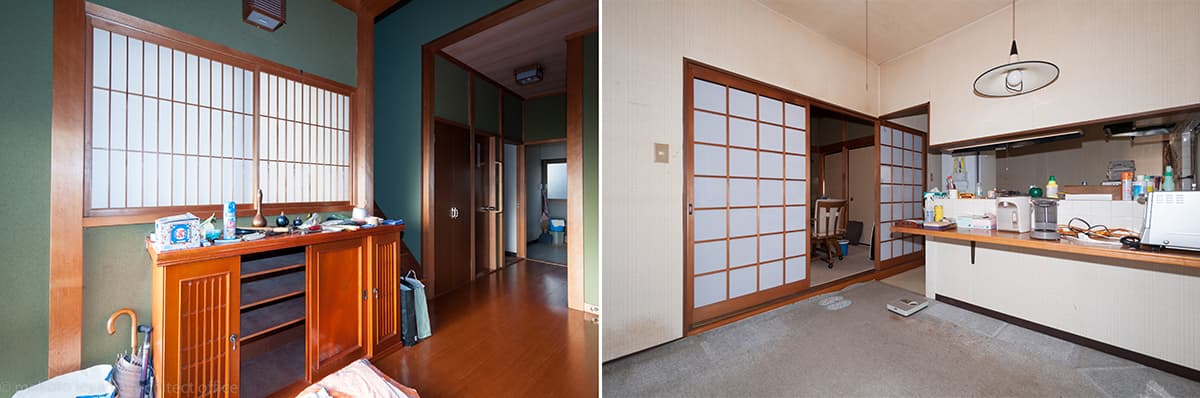 改修前の状況です。写真左は玄関から廊下を見たところです。奥には台所、廊下の途中に収納、トイレ、洗面のへのドアが並んでいます。写真右はリビングダイニングで、対面カウンター式のキッチンとなっていました。障子の向こうは和室の茶の間になっています。