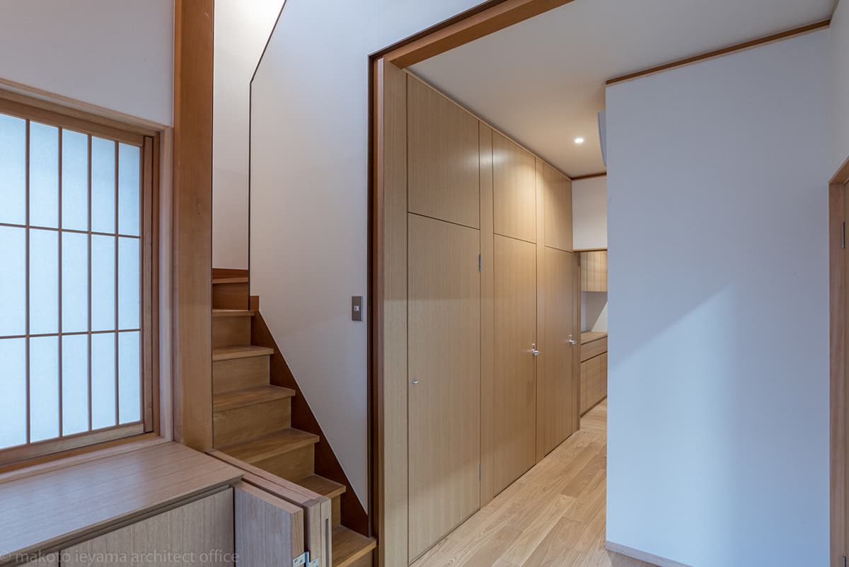 玄関から廊下を見たところです。壁は和紙貼りとし、収納・トイレ・洗面所のドアは閉めると床から天井いっぱいの一枚の大きなパネルのようにフラットに納まるようにしています。