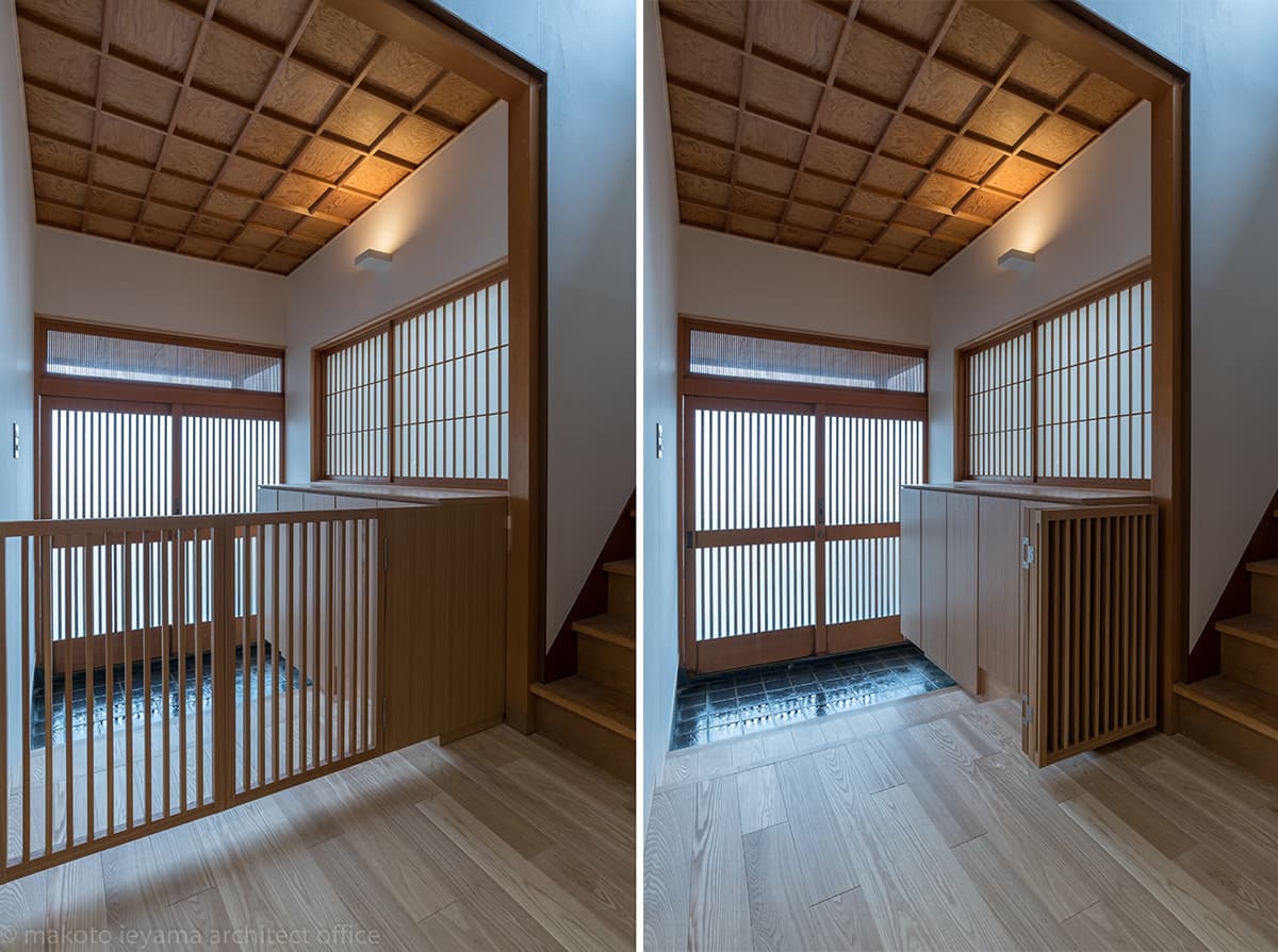 玄関側を見返すと、造り付けの下足入の家具と一体になった折りたたみ式の猫用のフェンスがあります。玄関の天井は既存の格天井をそのまま残しました。壁に付けた上向配光のブラケット照明で天井を照らす間接照明にしています。