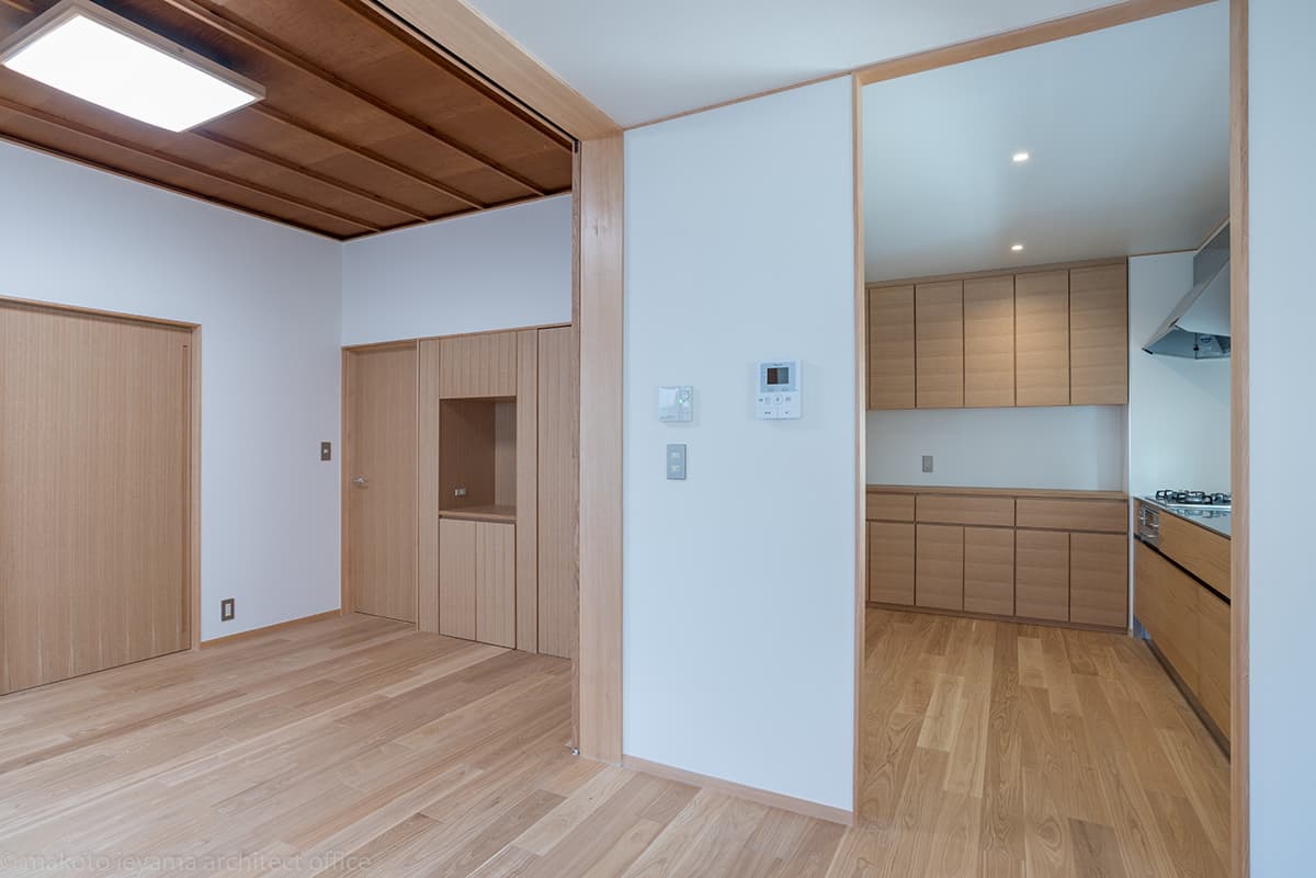 茶の間と、ダイニングをハンガー戸(吊戸)で仕切り、普段は開放して一体的に使っていますが、必要に応じて開閉することができます。ハンガー戸は床にレールが無いため床が連続し、常時開けて使う部屋の場合に適しています。左側のドアは玄関に繋がる廊下からの入口で、建具と同じ材料のホワイトオーク材で収納扉と仏壇置場を造り、ひとつの壁面を一体の家具のように見せています。壁はフェザーフィール塗(しっくい塗)です。