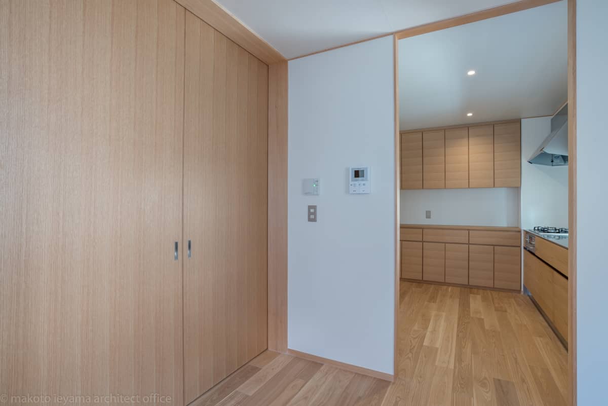 キッチンの収納棚のエンドパネルは廊下に繋がる引戸を閉めるとフラットに納まるようになっています。引戸を開けると、廊下に並ぶ洗面所などのドアパネルに連続します。