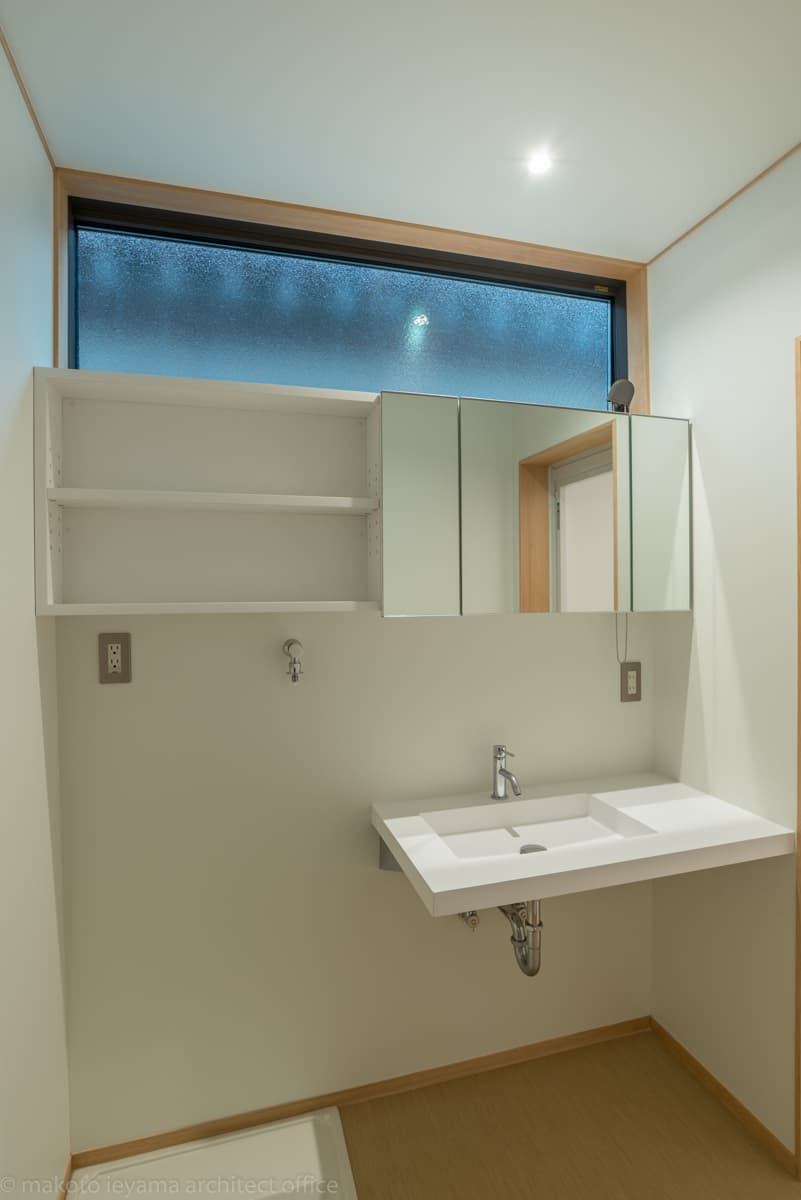洗面所は既製品の人工大理石の洗面カンターを使っていますが、正面の収納棚は、洗面カウンターの幅に合わせて三面鏡になるミラー収納としています。隣地が間近に迫っていることによるプライバシーの確保と、正面の壁が収納棚でふさがるため、高窓で採光と通風を確保しています。