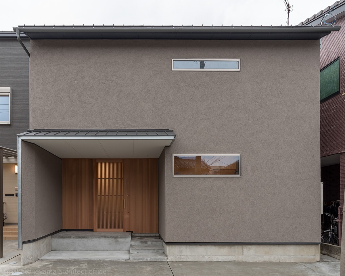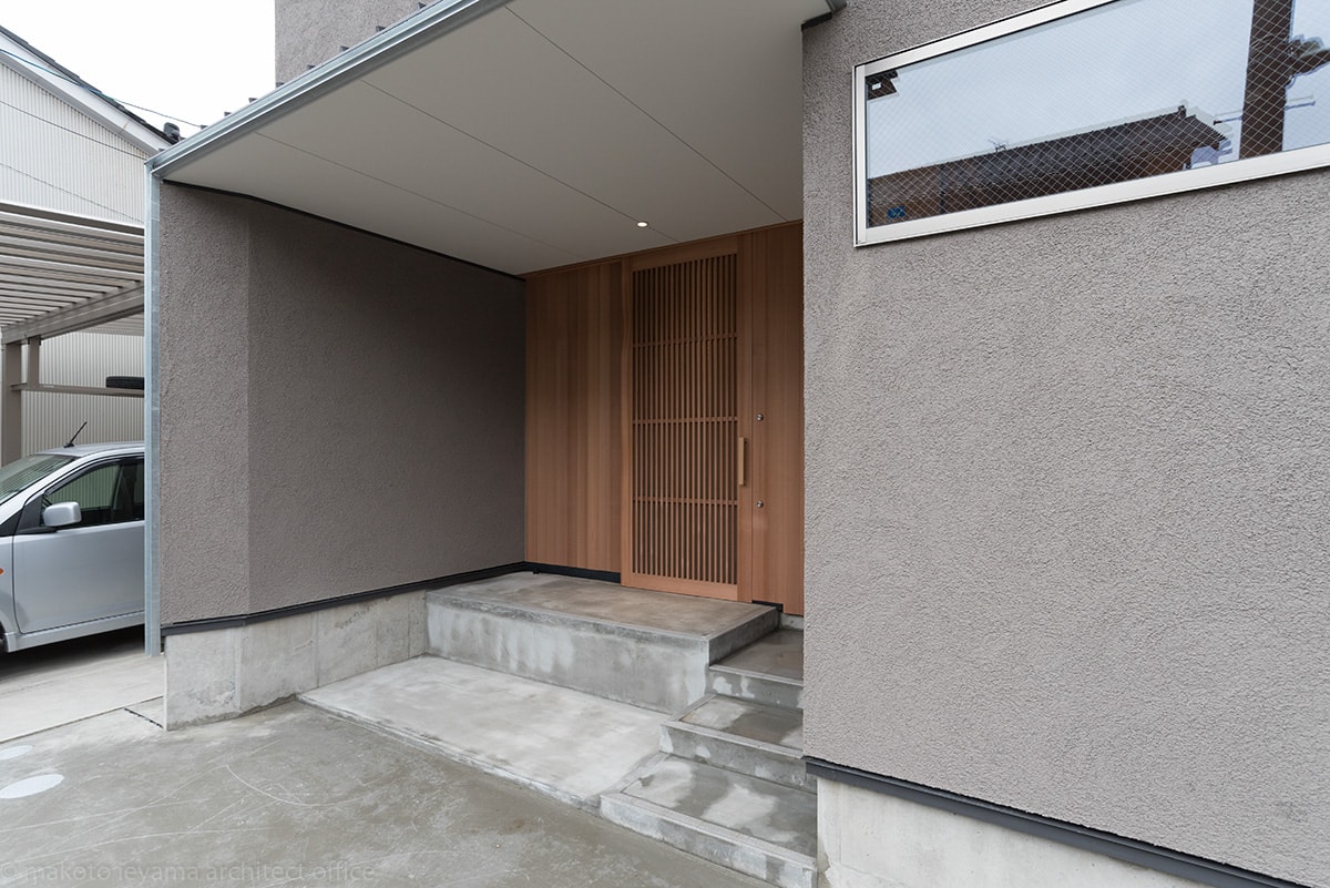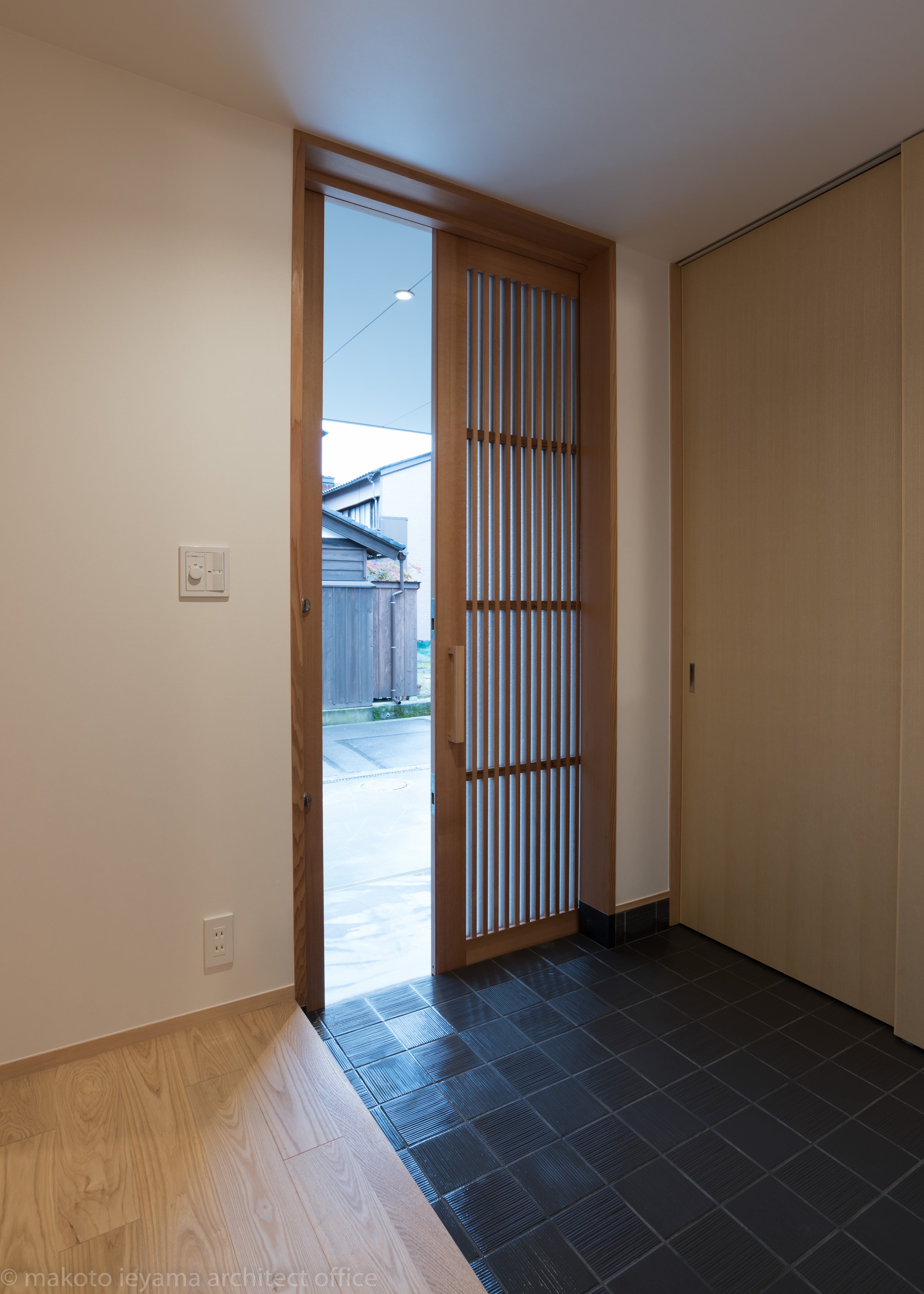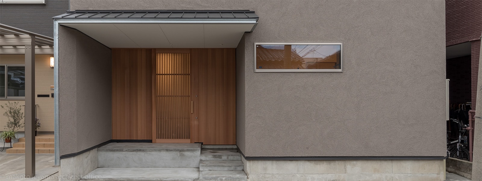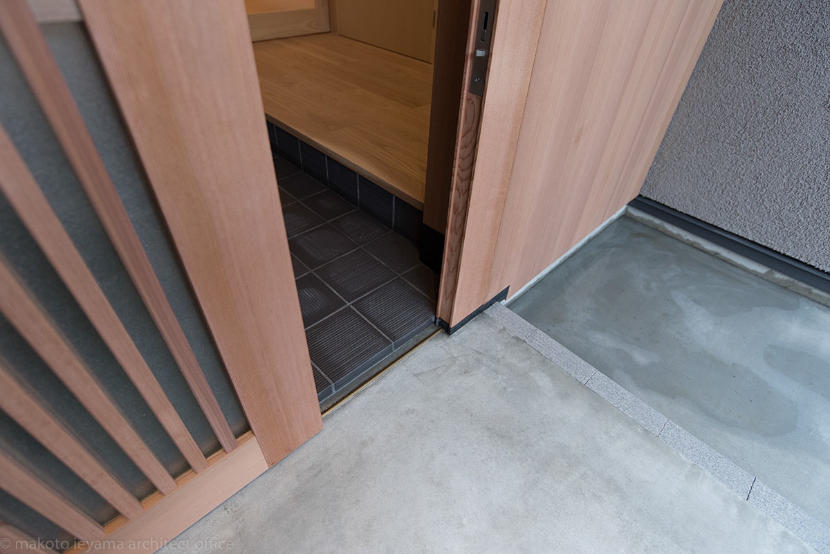 玄関庇と袖壁による防火壁によって隣地境界からの延焼ラインを避けて、玄関廻りに板張りの外壁と木製建具の玄関戸を設け、人を迎え入れる玄関としての雰囲気を創り出している。