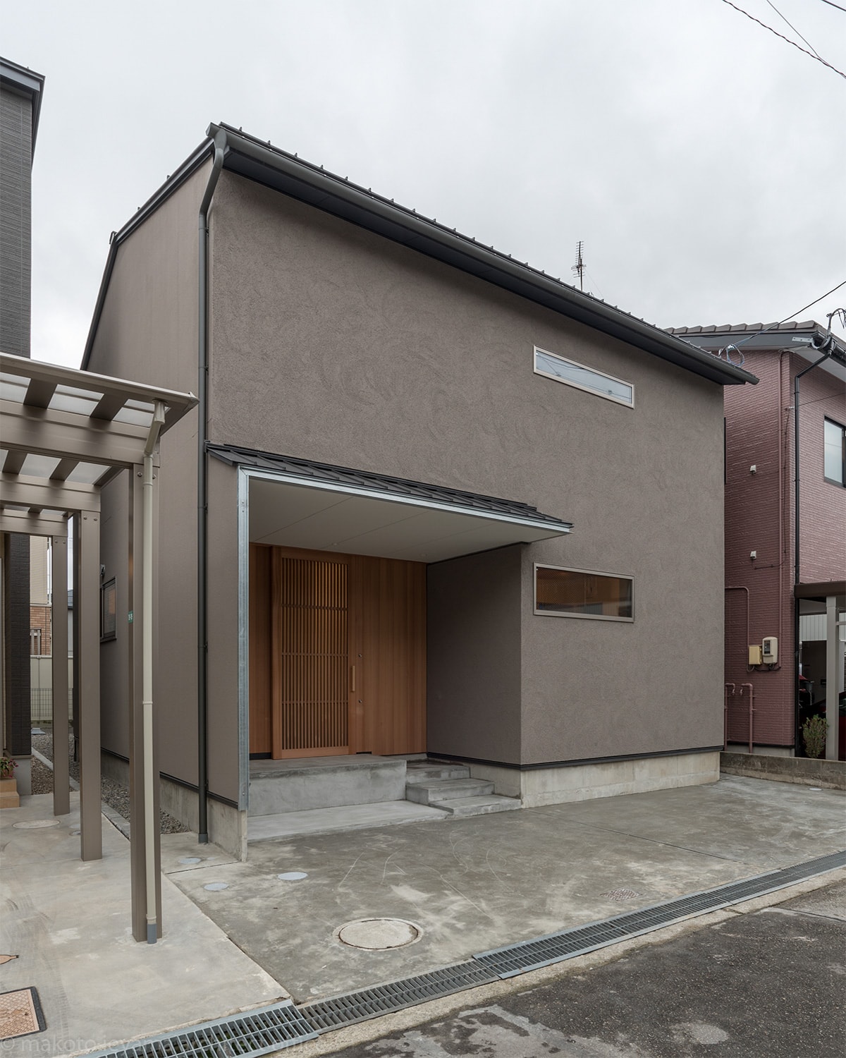 ジョリパット塗りの外壁と板張りの玄関が柔らかい素材感を出しています。建物側面の外壁はコストバランスを考えてジョリパットの吹付工法で仕上げています。