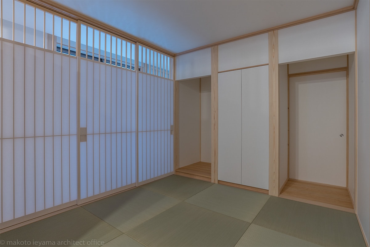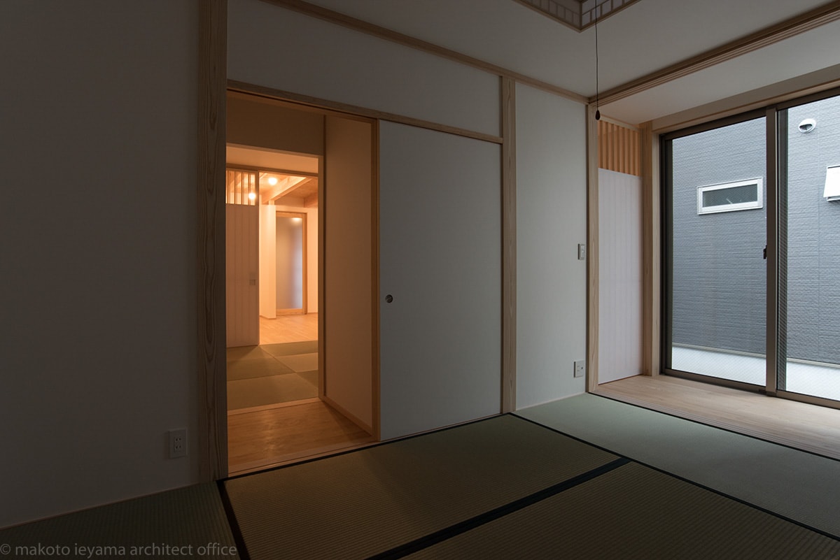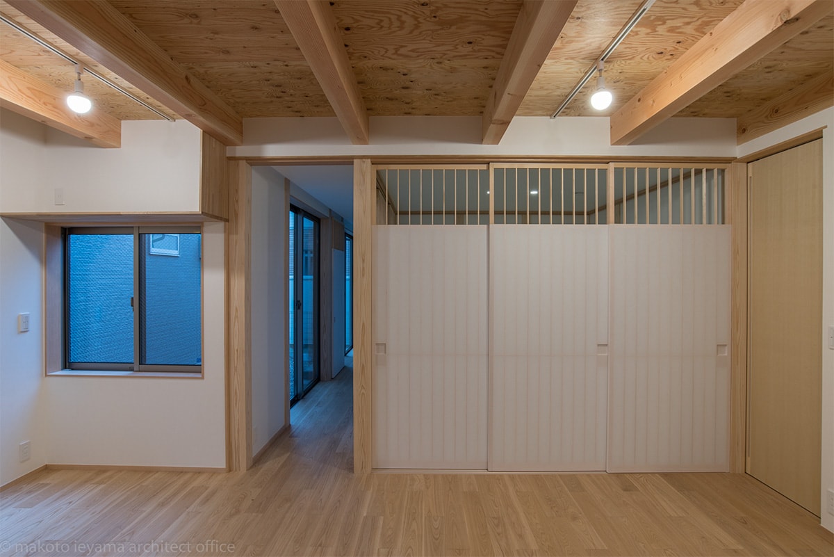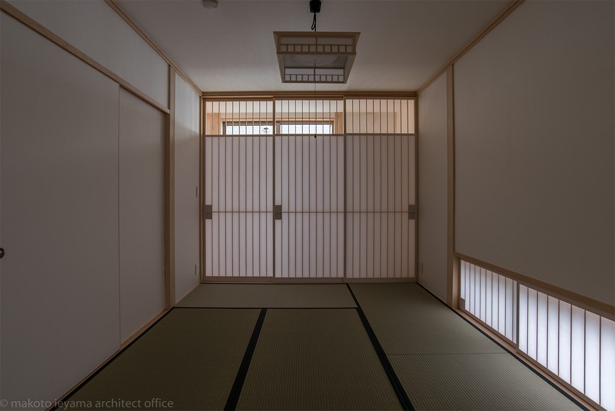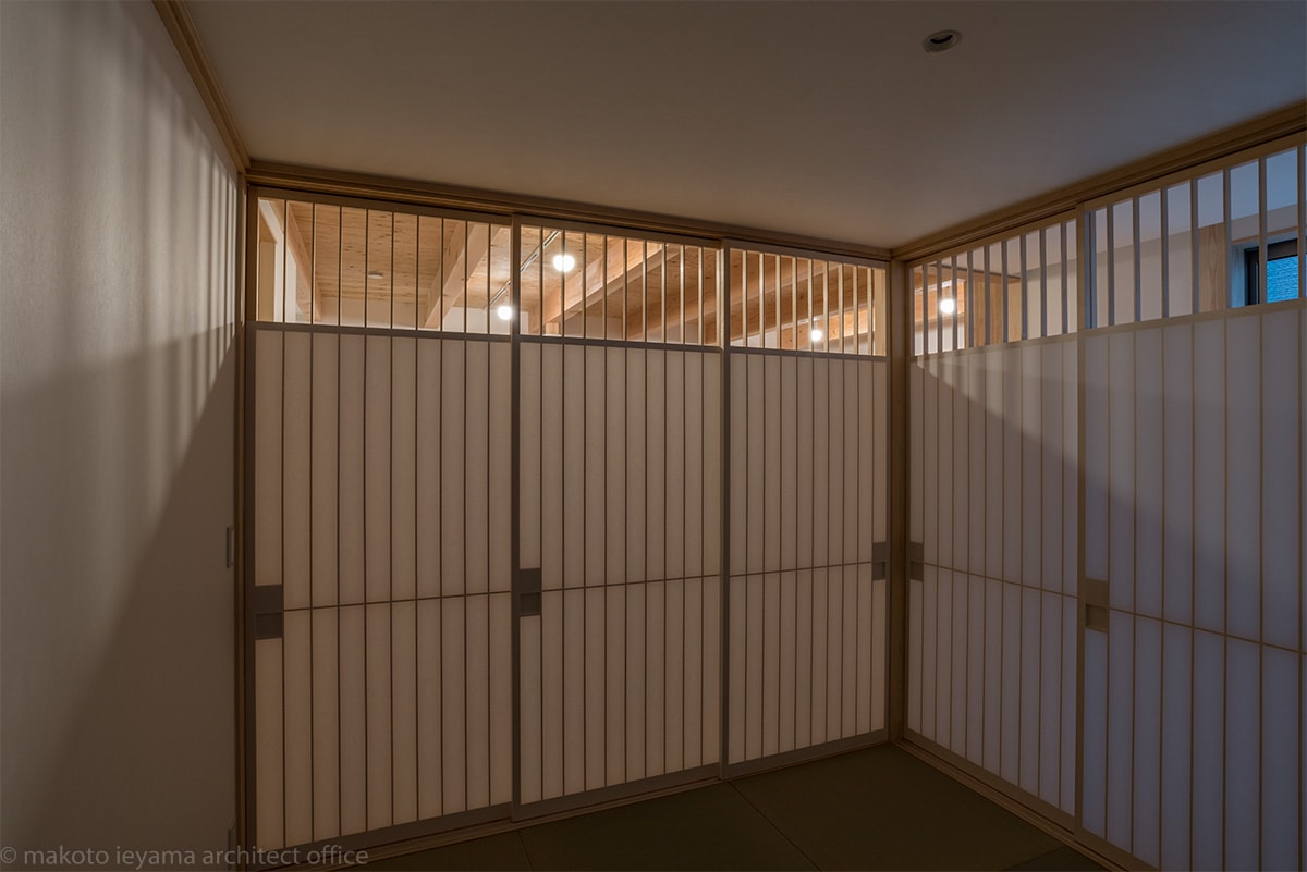 正面には、桟の両面に紙を張った太鼓張りの障子でリビング、縁側のそれぞれと仕切られています。手前の照明を消すと向こう側からのあかりが透過して、建具に縦桟のシルエットが映し出されます。障子の上部は桟のみで、閉めていても床暖房されたリビングスペースと一体の空間としてつながっています。