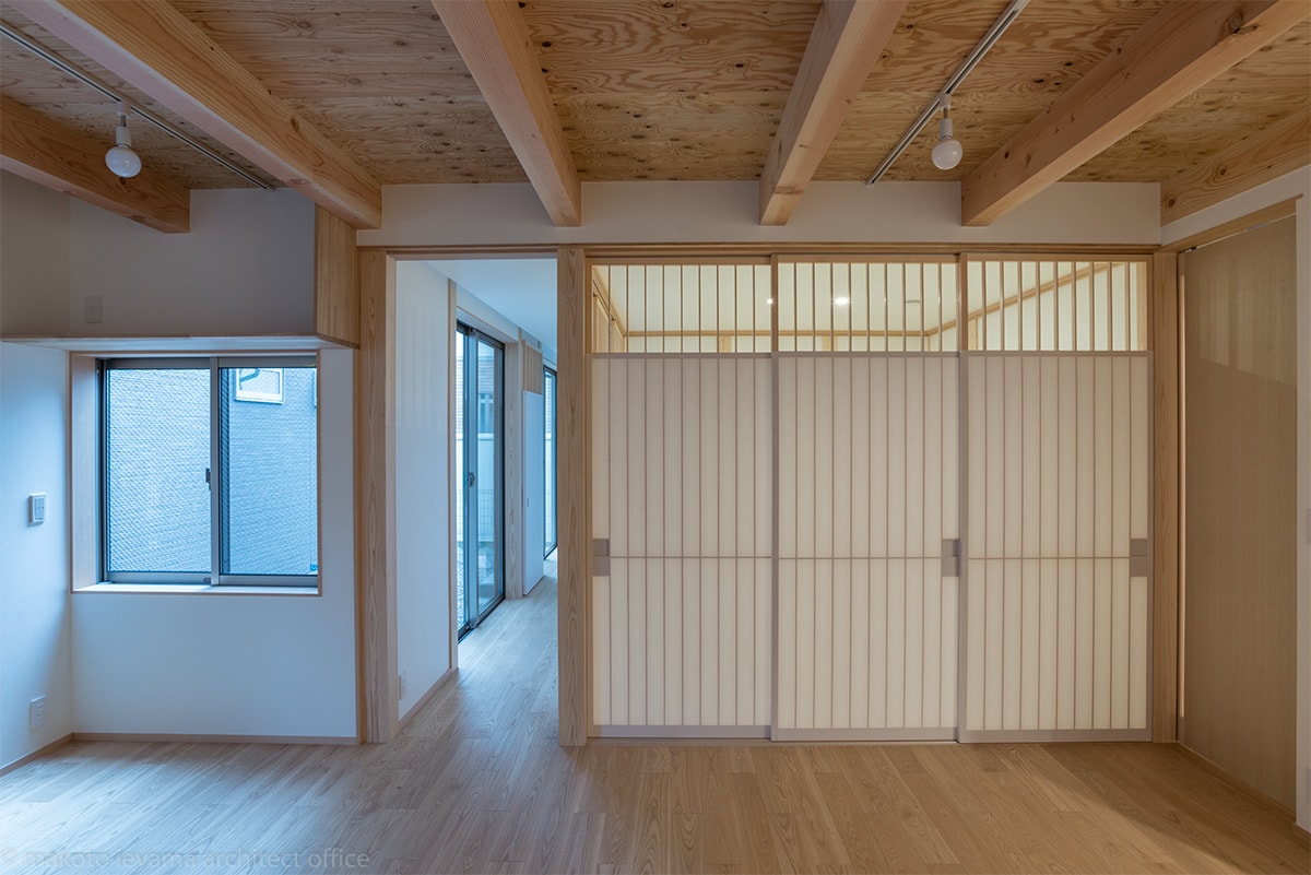 内部はLDKとそれに続く畳コーナー(仏間)を中心に、洋室と和室の個室が手前と奥にあります。左側の窓の奥に見える外部空間が唯一の庭で、奥の和室につながる縁側を経由して居室の採光・通風を確保しています。天井は2階の床下地の28ミリの合板がそのままあらわしとなっています。
