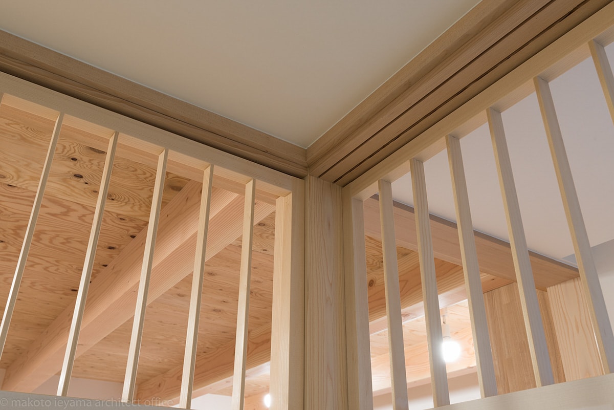 畳コーナーからリビングを見たところです。4帖半の小さな空間ですが、光が透過することと、上部が抜けていることによって圧迫感の無いスペースになりました。